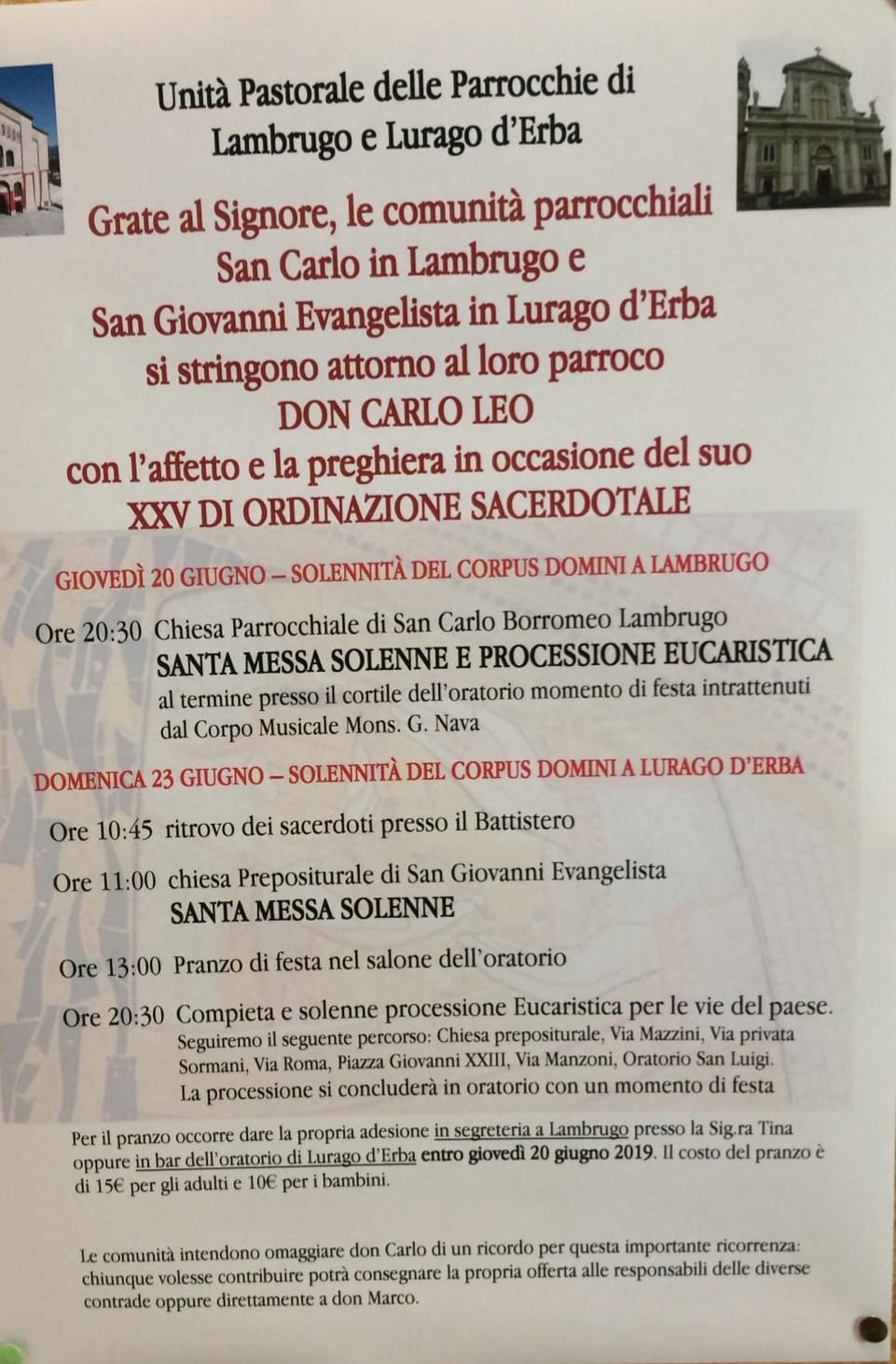 Due gli appuntamenti, in occasione della Solennità del Corpus Domini: giovedì 20 giugno, Messa e processione eucaristica alle 20.30. Al termine, nel cortile dell’oratorio di Lambrugo, momento di festa con il corpo musicale monsignor Nava.
