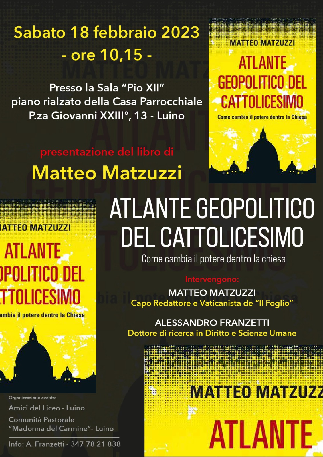 «Abbiamo voluto invitare Matteo Matzuzzi, una delle penne di punta de Il Foglio, per presentare questo bel volume che offre uno spaccato completo e aggiornato della Chiesa nel mondo di oggi – affermano gli organizzatori- inoltre allo stesso tempo siamo contenti e ringraziamo il prevosto di Luino don Sergio Zambenetti per aver messo a disposizione la magnifica sala “Pio XII”, recentemente restaurata e adatta a eventi come questo. Aspettiamo tutti – concludono- credenti o laici perché l’argomento tocca ogni persona».