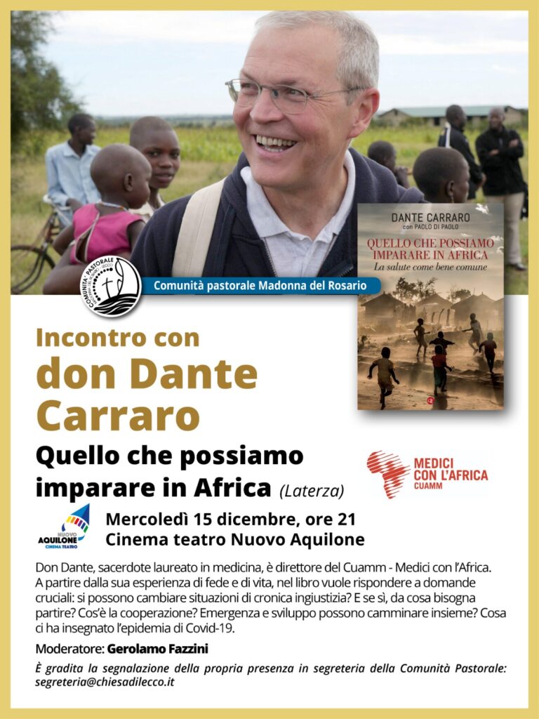 Mercoledì 15 dicembre alle ore 21 presso il Cine teatro Nuovo Aquilone, don Dante Carraro, sacerdote e medico, direttore del CUAMM, presenterà il suo libro “Quello che possiamo imparare in Africa”, Laterza Editore.