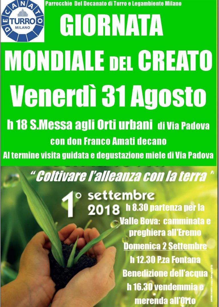 La Giornata Mondiale di Preghiera per il Creato (1˚ settembre) venne istituita dalla Chiesa Ortodossa nel 1989. Da allora, molte altre Chiese cristiane si sono unite alla celebrazione, tra cui la Chiesa Cattolica, dopo la Lettera enciclica di Papa Francesco Laudato sì sulla cura della casa comune. Anche quest’anno la giornata verrà celebrata dalla Parrocchia di San Giovanni Crisostomo in collaborazione con gli Orti urbani di Via Padova e Legambiente lombardia.