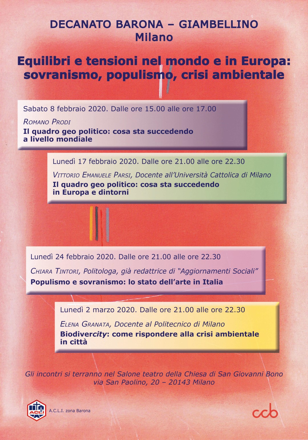 Il decanato Barona Giambellino di Milano organizza una serie di quattro serate di formazione socio politica sul tema “Equilibri e tensioni nel mondo e in Europa: sovranismo, populismo, crisi ambientale”.