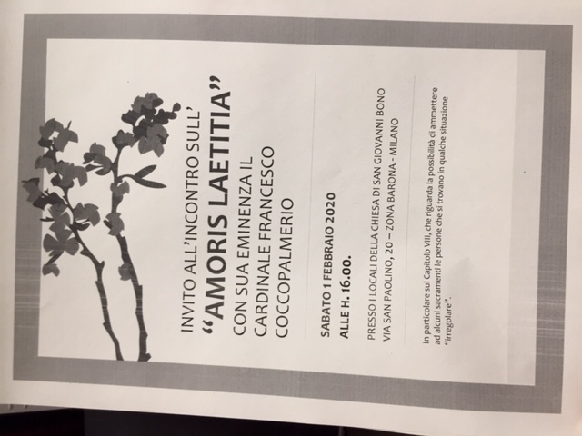Sabato 1 febbraio, alle 16, presso la chiesa di San Giovanni Bono (Zona Barona) a Milano, il cardinale Francesco Coccopalmerio terrà un incontro sull’Amoris Laetitia di Papa Francesco, approfondendo in particolare il capitolo VIII, che riguarda la possibilità di ammettere ad alcuni sacramenti le persone che si trovano in qualche situazione “irregolare”.