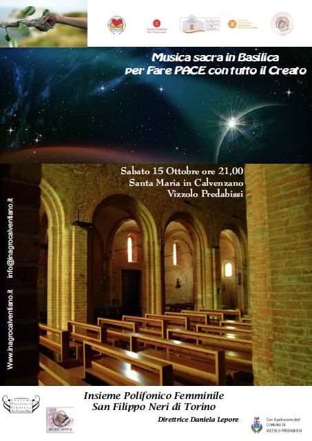L’Associazione In Agro Calventiano in occasione della Festa Patronale di S. Maria in Calvenzano di Vizzolo Predabissi, organizza per sabato 15 ottobre un concerto di musica sacra in basilica. Sarà presente il Coro polifonico Femminile San Filippo Neri di Torino, diretto da Daniela Lepore.