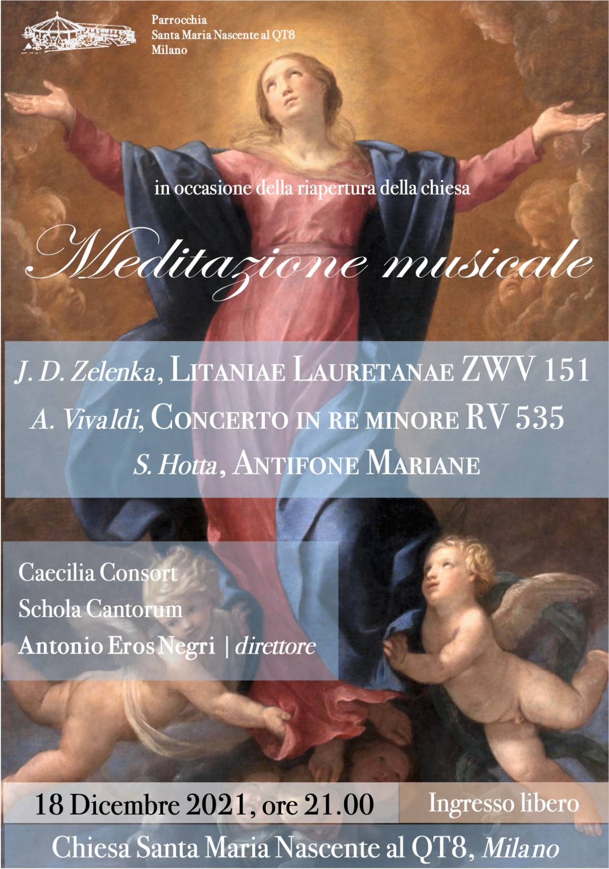 Sabato 18 Dicembre, sempre alle ore 21.00, si terrà in chiesa una Meditazione musicale, il cui programma sarà orientato alla contemplazione della Vergine Maria, patrona della chiesa e della comunità di QT8.