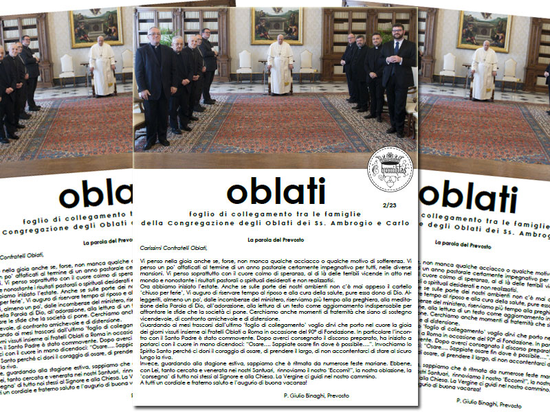 Infine, Mons. Delpini ha aggiunto due punti importanti che ha consegnato ai Fratelli Oblati come programma di vita: l’essere lieti e santi. L’essere lieti deriva non dalle circostanze favorevoli, ma dall’appartenenza a Cristo, dalla piena consapevolezza della propria scelta di vita. Non bisogna cercare il compiacimento in ciò che si è chiamati a fare, ma in ciò che si è scelto di essere. E poi la santità di vita, che è la sintesi di una bella fraternità e di una piena letizia.