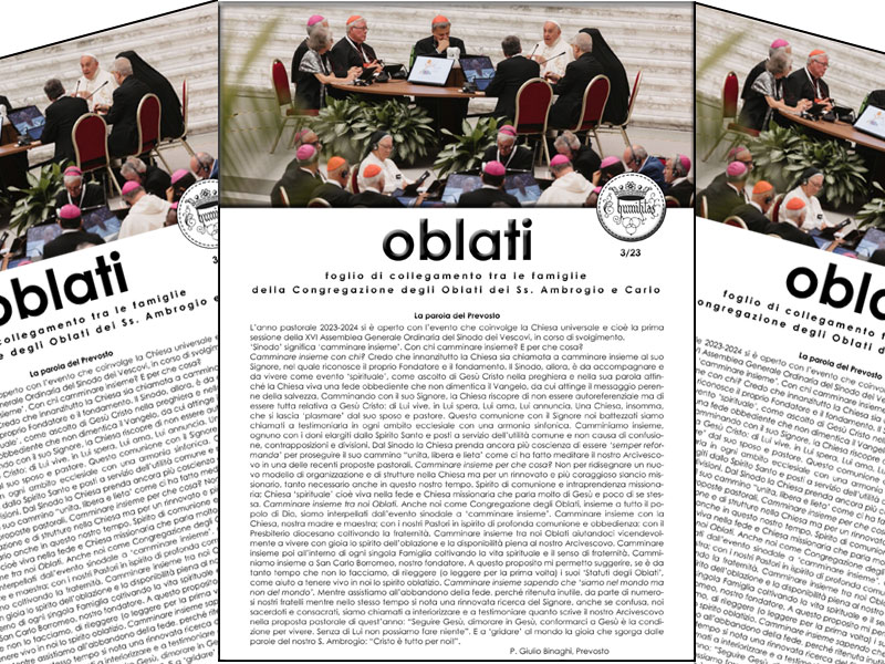 Siete “Fratelli”, siete “Oblati”, e siete “Diocesani”. Il Fondatore, Beato Cardinale Schuster, ha maggiormente sottolineato l’oblazione, l’offerta di vita nella consacrazione e nel servizio al Seminario (dove i fratelli erano conosciuti semplicemente come “Oblatini”); il Cardinale Martini ha accentuato la diocesanità: l’apertura della Comunità al servizio ben più ampio della diocesi ambrosiana. Oggi invece con la scelta precisa della vita comunitaria nelle due case di Milano e Rho sottolineiamo maggiormente la fraternità, segno importante in una società e in un mondo individualistici come quelli di oggi. Ma mi sembra che sia saggio non assolutizzare uno di questi tre aspetti che qualificano la vostra vocazione, ma tenerli tutti insieme.