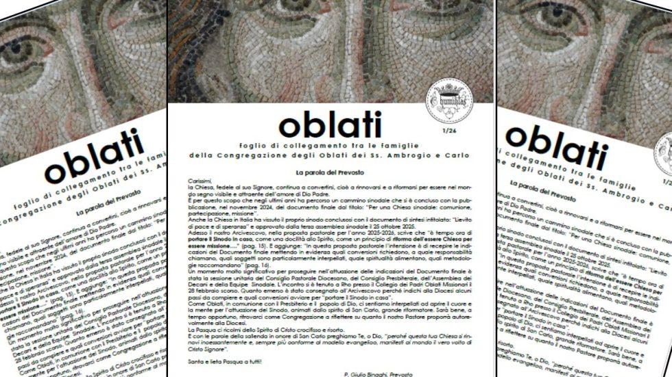 Come Oblati, in comunione con il Presbiterio e il popolo di Dio, ci sentiamo interpellati ad aprire il cuore e la mente per l’attuazione del Sinodo, animati dallo spirito di San Carlo, grande riformatore. Sarà bene, a tempo opportuno, ritrovarci come Congregazione a riflettere su quanto il nostro Pastore proporrà autore-volmente alla Diocesi.