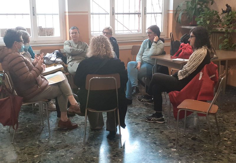 Al fuoco ci ha pensato il laboratorio seguente, costruito attraverso la formazione di strani labirinti, nei quali i partecipanti si sono mossi in momenti ora intensi ora vivaci, mentre la comunicazione fluiva con impensata facilità e tutti si “sguardavano”, si conoscevano, si apprezzavano. Fiorivano così sorprese che generavano sorrisi, emozioni che sbocciavano in pensieri e riflessioni, meraviglie che evocavano ricordi e racconti, scoperte di esperienze comuni. Sono i miracoli della comunicazione profonda, quella vera, pensosa, nutrita di rispetto e di un’affidabilità che permette di mettere i propri sentimenti a dimorare nel nido affettivo e sicuro dell’altro. Banditi il riserbo e la vergogna.