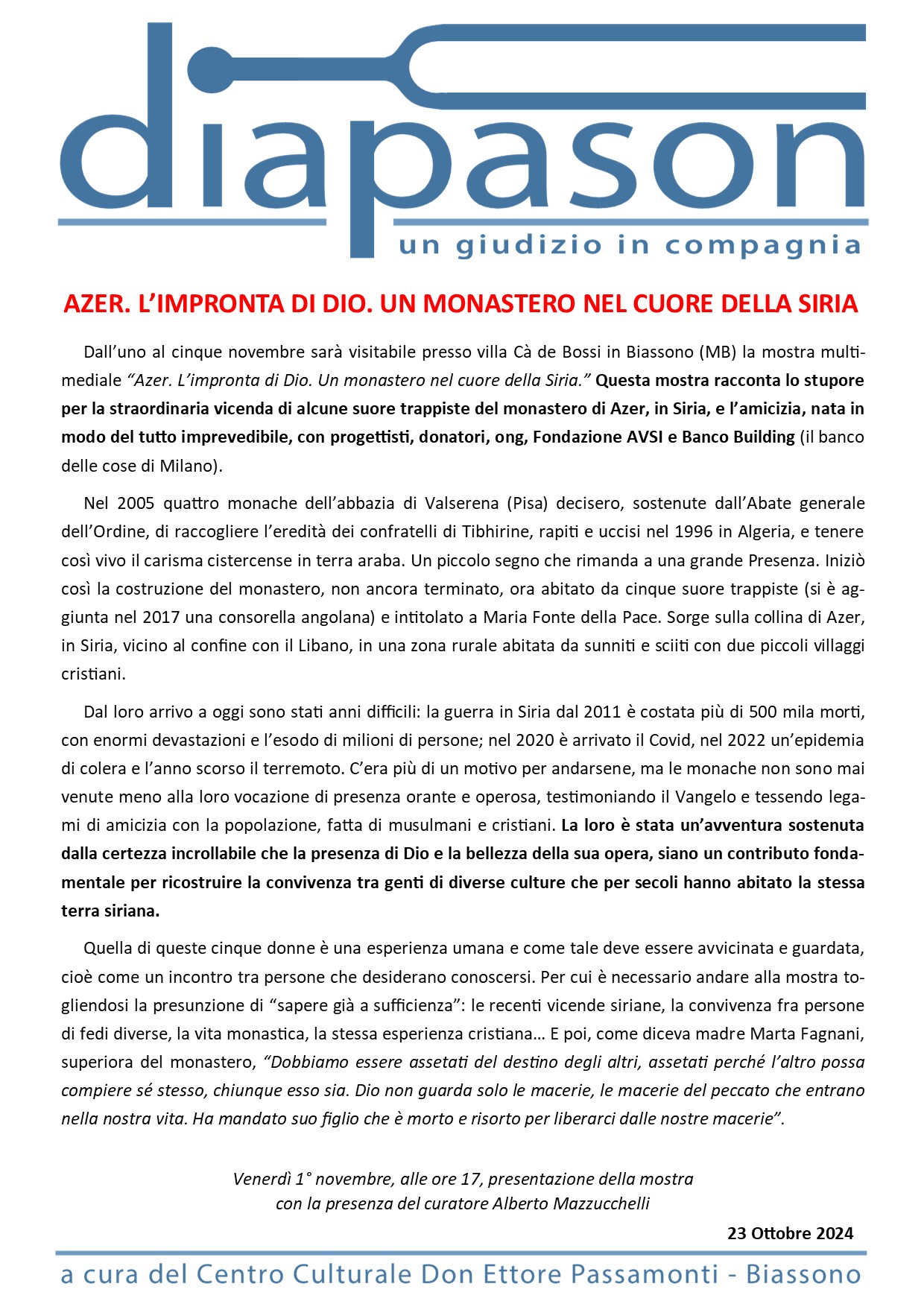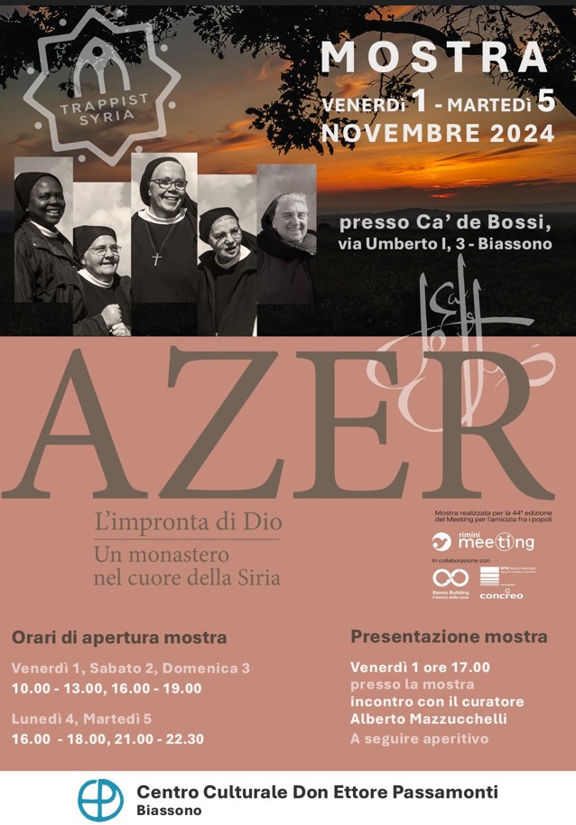 In un contesto di guerra fiorisce un seme di pace. E’ quello del monastero di Azer che, in una Siria martoriata da una guerra civile da tredici anni e 229 giorni con una scia di sangue di 500 mila vittime, cerca di riaffermare la concordia tra gli uomini attraverso l’azione pastorale e la preghiera preziosa e incessante di alcune suore trappiste. La loro esperienza, attraverso la quale si potrà avere anche un ritratto nitido del dramma che sta attraversando il paese, vivrà in una mostra intitolata appunto “Azer, l’impronta di Dio, un monastero nel cuore della Siria” in programma da venerdì 1 a martedì 5 novembre nello spazio di Ca’de Bossi di via Umberto I 3 a Biassono.