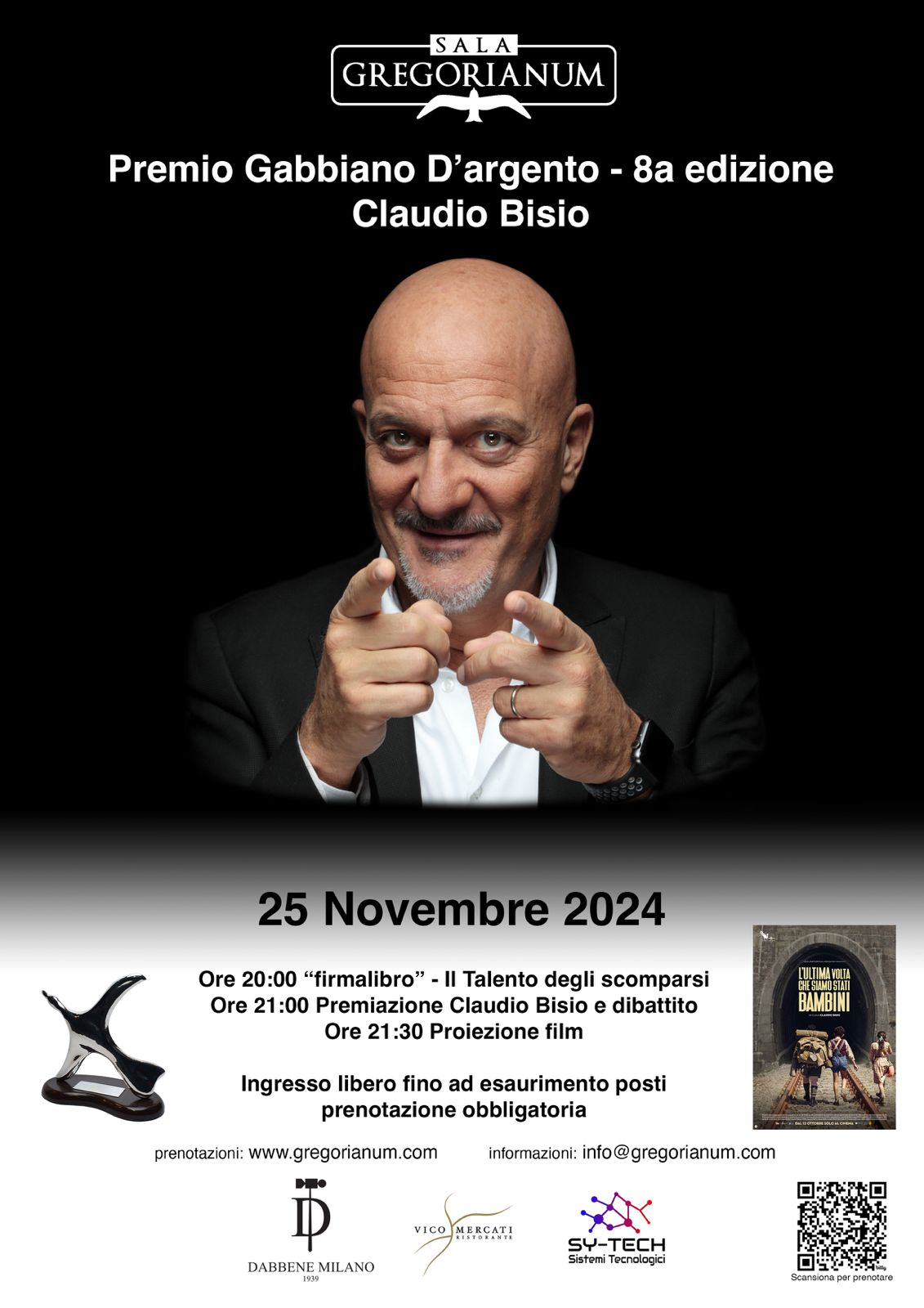 Sarà Claudio Bisio a ricevere la sera del 25 novembre il Premio “Gabbiano d’Argento”, riconoscimento promosso dalla Sala Gregorianum di Milano e giunto alla sua 8° edizione.