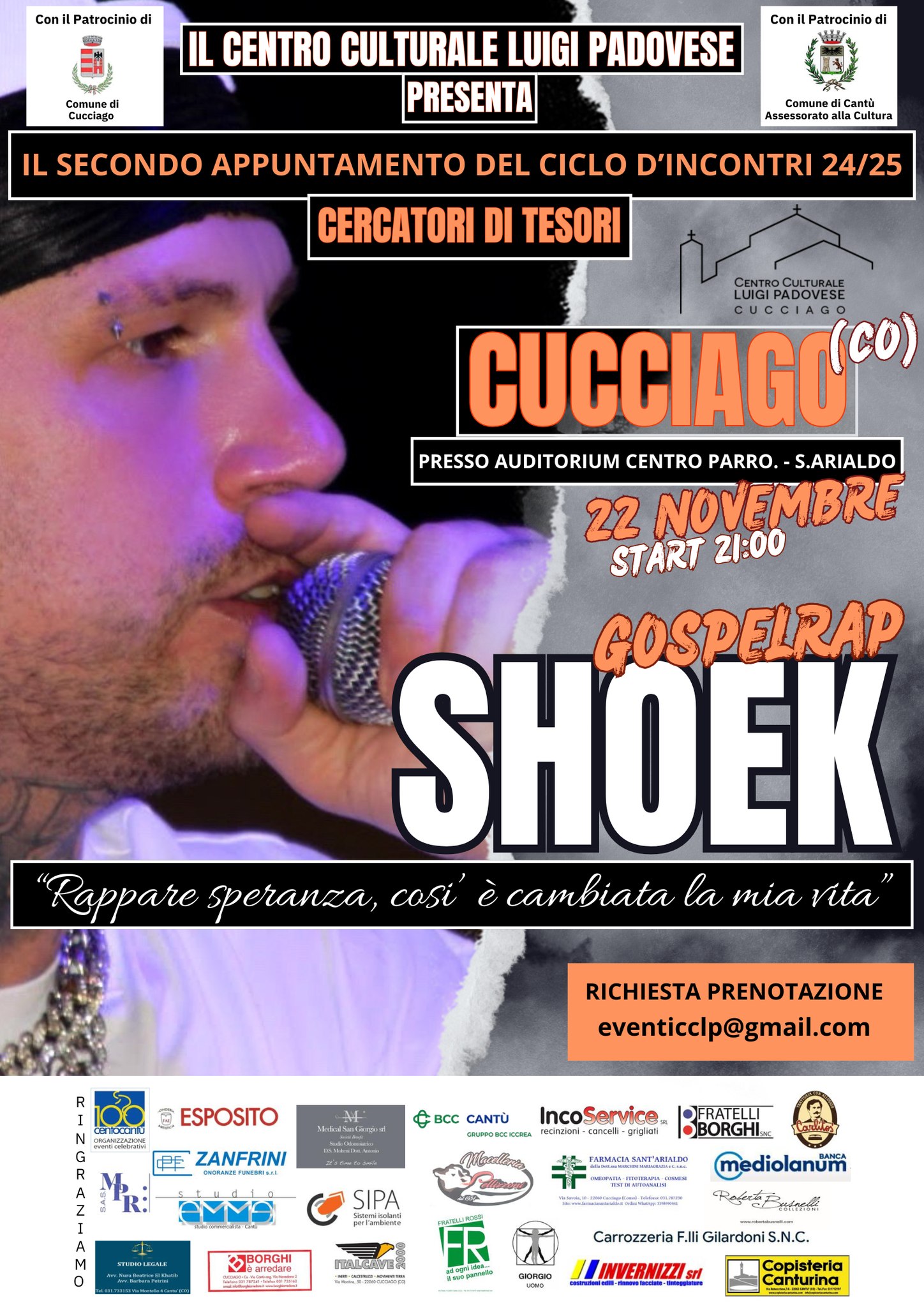 Shoek si racconterà venerdì 22 novembre alle 21 all’auditorium del centro parrocchiale Sant’Arialdo di Cucciago in una serata dal titolo “Rappare speranza: così è cambiata la mia vita” organizzato dal centro culturale Luigi Padovese. Dai titoli di alcune sue produzioni discografiche il suo senso di ricerca emerge già appieno. E’ il caso di “Inferno in un angelo”, “Solo tu”, “Torno a te” e “La vera verità”. Per la serata occorre prenotarsi indirizzando una email all’indirizzo eventicclp@gmail.com.