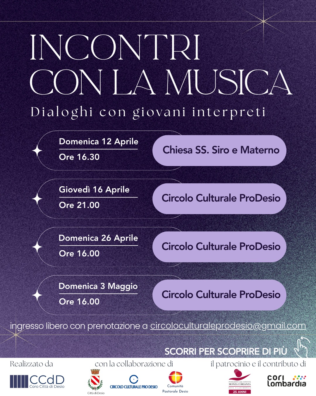 Il Coro Città di Desio, in collaborazione con il Circolo Culturale ProDesio e la Comunità Pastorale, organizza un ciclo di concerti dal titolo “Incontri con la musica. Dialoghi con giovani interpreti”.