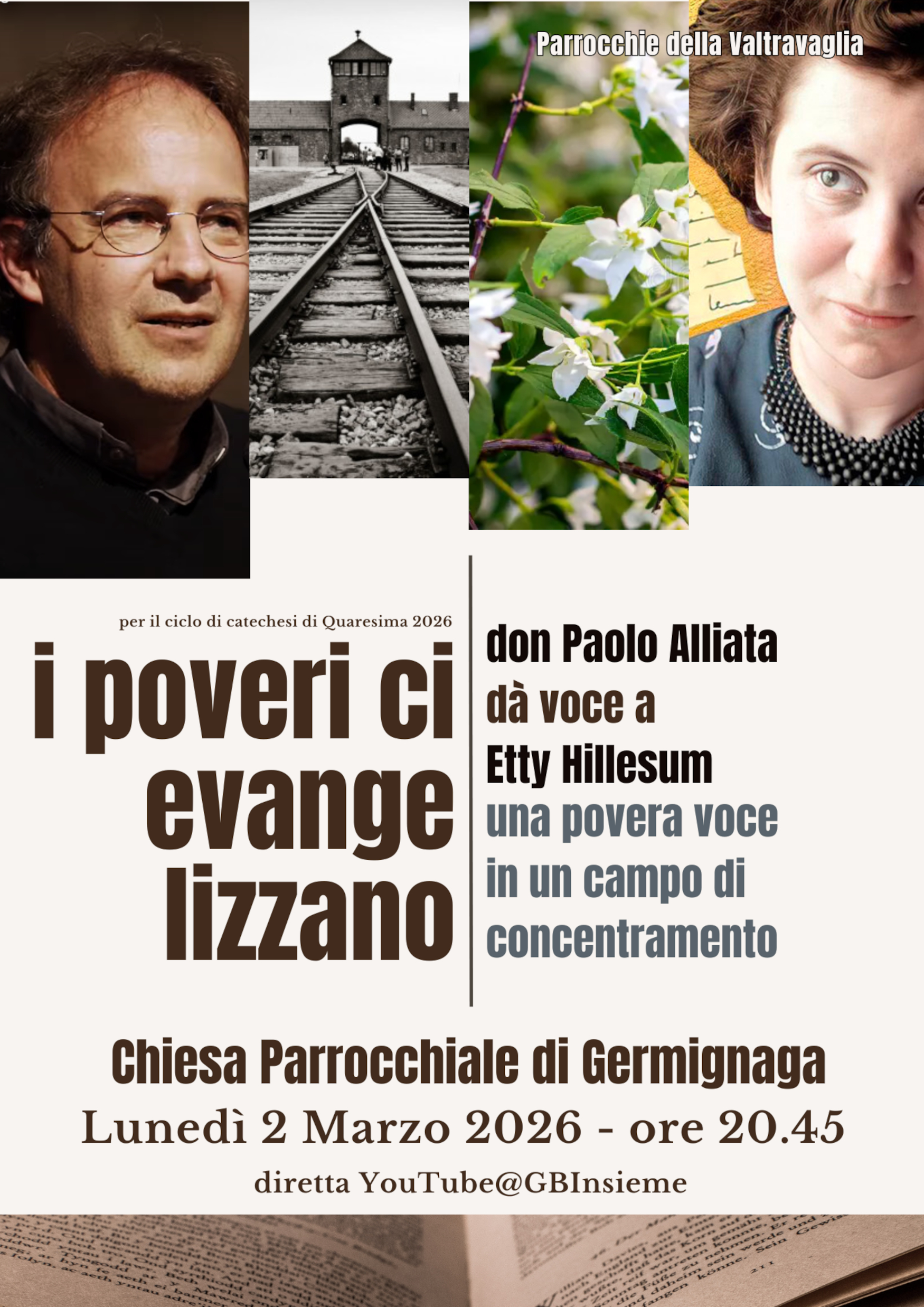 All’interno della proposta di catechesi quaresimale “I poveri ci evangelizzano” le parrocchie della Valtravaglia (Brezzo di Bedero, Castelveccana, Domo, Germignaga, Nasca e Porto Valtravaglia), propongono per lunedì 2 marzo alle ore 20.45, presso la chiesa parrocchiale di Germignaga, l’incontro con don Paolo Alliata “Una povera voce in un campo di concentramento” che proporrà una riflessione a partire dal libro I diari di Hetty Hillesum. Hetty, ebrea olandese, morta ad Auschwitz nel 1943 all’età di 27 anni, ha lasciato un diario scritto tra il 1941 ed il 1943, l’ultima parte durante la sua permanenza nel campo di smistamento di Westerbork in Olanda, prima del trasferimento ad Auschwitz. In un periodo buio della storia, le sue riflessioni, la sua forza d’animo diventano un inno alla vita che ancora oggi ci parlano e diventano fonte d’ispirazione.