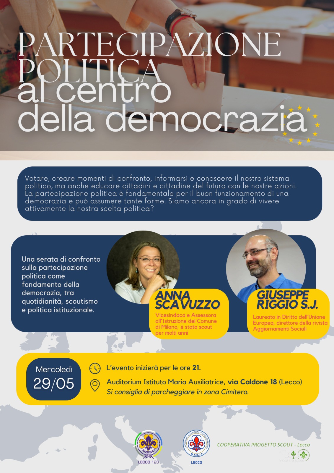 Mercoledì 29 maggio alle 21, presso l’Istituto Maria Ausiliatrice di Lecco, si terrà un incontro sulla partecipazione politica come fondamenta della democrazia, tra quotidianità, scoutismo e politica istituzionale.