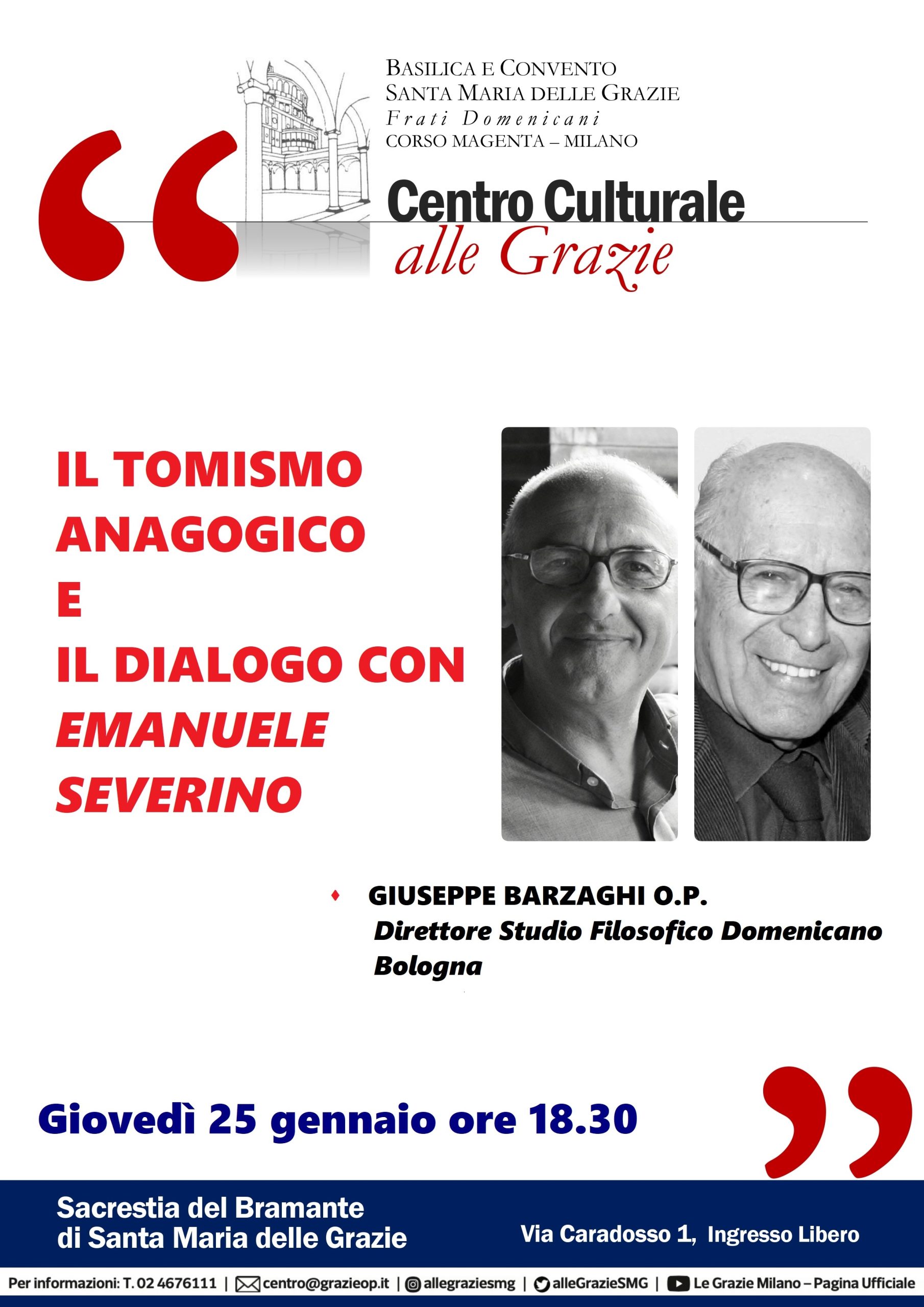 Giovedì 25 gennaio alle ore 18.30 presso la Sacrestia Monumentale del Bramante (via Caradosso, 1 – corso Magenta) il Centro culturale alle Grazie dei Padri Domenicani organizza un incontro con fra Giuseppe Barzaghi, filosofo e teologo. Padre Barzaghi parlerà di Tomismo anagogico e dialogo con Emanuele Severino.