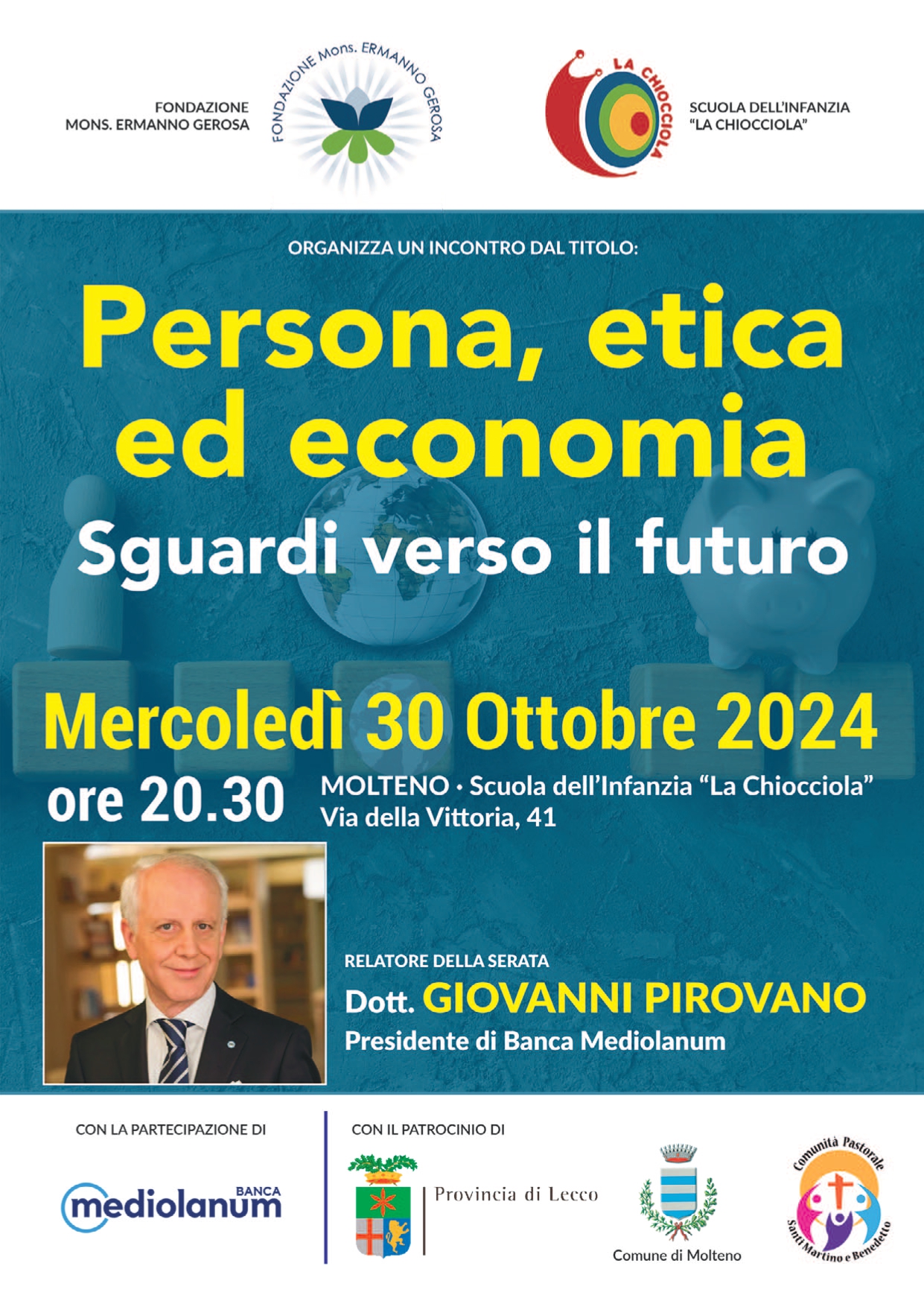 La Fondazione Monsignor Ermanno Gerosa e la Scuola dell’Infanzia paritaria “La Chiocciola” di Molteno (Lecco) organizzano una serata di approfondimento dal titolo “Persona, etica ed economia. Sguardi verso il futuro” in programma mercoledì 30 ottobre alle ore 20.30 – presso la sede della Scuola, in via della Vittoria, 41 – Molteno (Lecco).