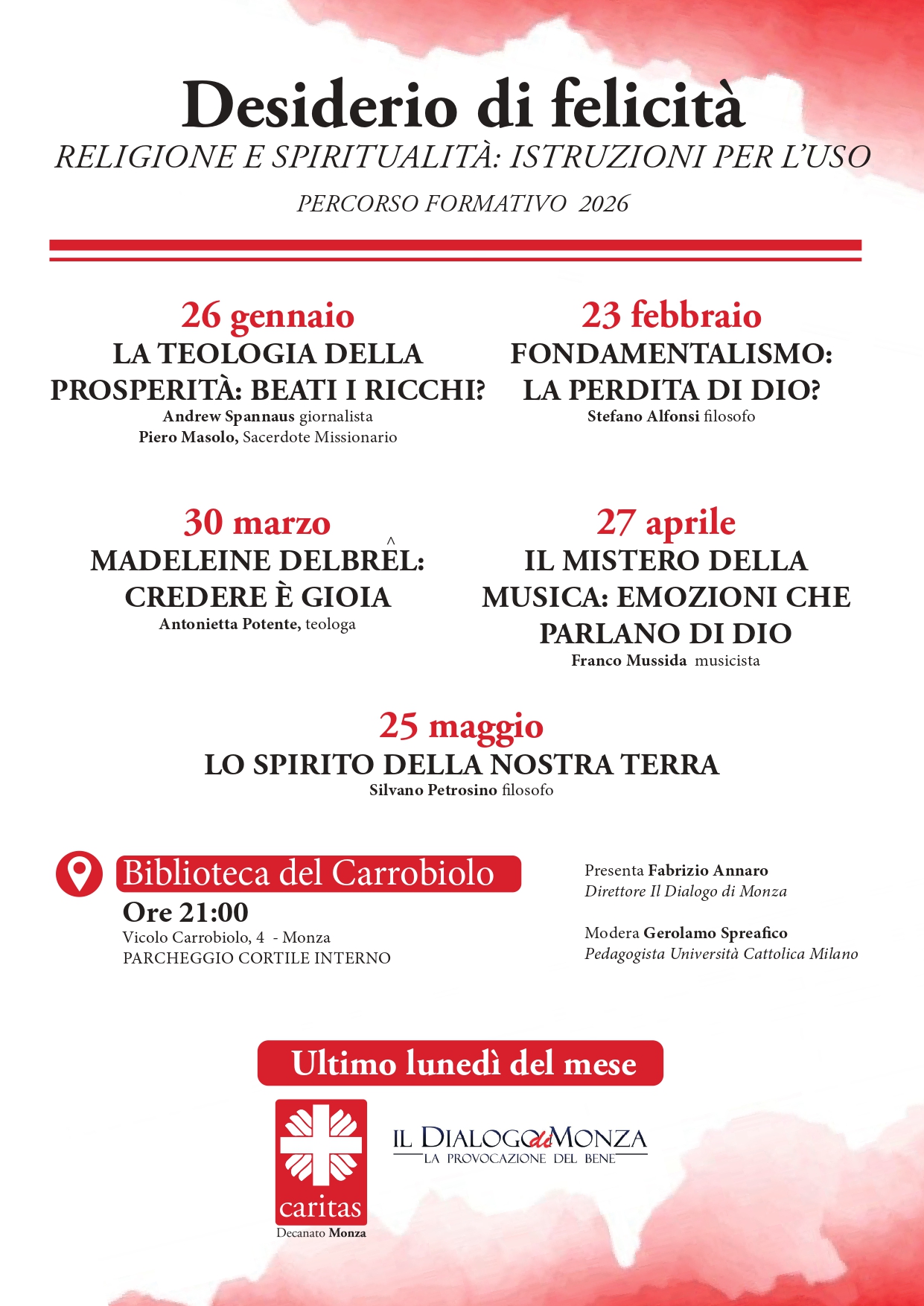 “Desiderio di felicità Religione e spiritualità: istruzioni per l’uso” è il titolo del percorso formativo 2026 promosso dalla Caritas di Monza. Il primo appuntamento è in programma per il prossimo lunedì 26 gennaio alle ore 21 presso Sala della Biblioteca del Carrobiolo, Ore 21:00 – Vicolo Carrobiolo, 4 – Monza – (Parcheggio cortile interno).