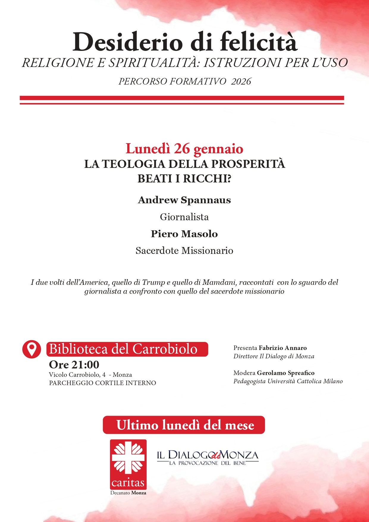 Titolo di questa prima serata è: La Teologia della Prosperità: Beati i ricchi? Interverranno il giornalista Andrew Spannaus e il missionario Pietro Masolo. Un’occasione per approfondire i due volti dell’America, quello di Trump e quello di Mamdani, raccontati con lo sguardo del giornalista a confronto con quello del sacerdote missionario. Di più. Si potranno riprendere i tanti temi di attualità di questi tempi difficili: Venezuela, Groenlandia, Europa … Quello che pensa l’America e quello che potrebbe accadere sul piano interno ed internazionale. Ma soprattutto è sullo spirito dei nostri giorni che si focalizzerà l’incontro.