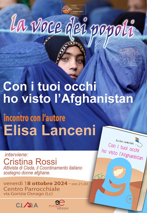Venerdì 18 ottobre alle 21, presso il Centro parrocchiale di via Gorizia a Osnago, Elisa Lanceni presenterà il suo libro “Con i tuoi occhi ho visto l’Afghanistan” insieme a Cristina Rossi, attivista di Cisda (Coordinamento italiano donne afghane).