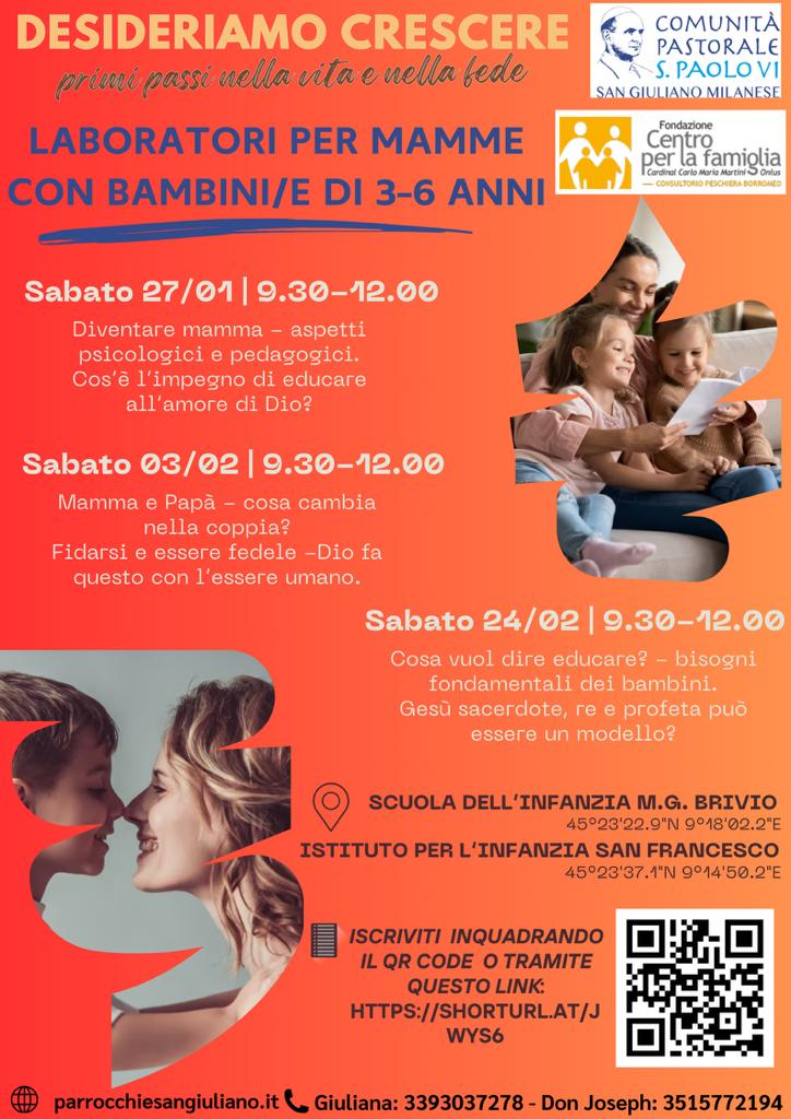 Come per la versione per i papà, i laboratori saranno condotti da professioniste del consultorio di Peschiera Borromeo, affiancate da due figure ben note all’interno delle scuole ( le dott.sse Murabito e Ruffini) e, novità di quest’anno, da tre componenti della diaconia (Albina, Ausiliaria diocesana, Arianna, Discepola del Vangelo e don Joseph, sacerdote nella Comunità Pastorale).