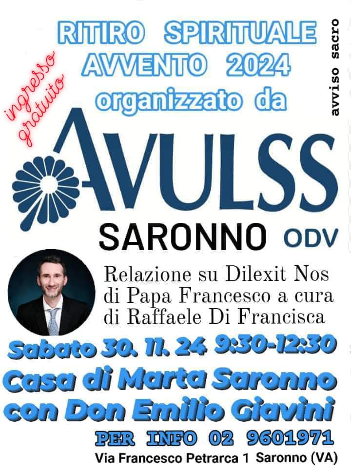 Sabato 30 novembre alle 9.30 a Saronno si terrà un ritiro spirituale di Avvento organizzato dal Avulss cittadina presso la Fondazione casa di Marta.