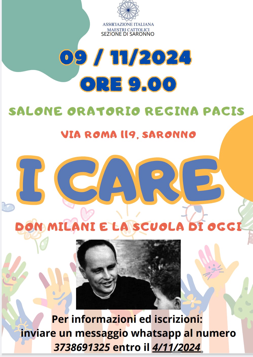 Sabato 9 novembre alle ore 9, nel salone dell’Oratorio Regina Pacis di Saronno (Via Roma 119 Saronno – Va), la Sezione AIMC Associazione Italiana Maestri Cattolici di Saronno organizza una conferenza dedicata a Don Lorenzo Milani dal titolo “I Care – Don Milani e la scuola di oggi”.
