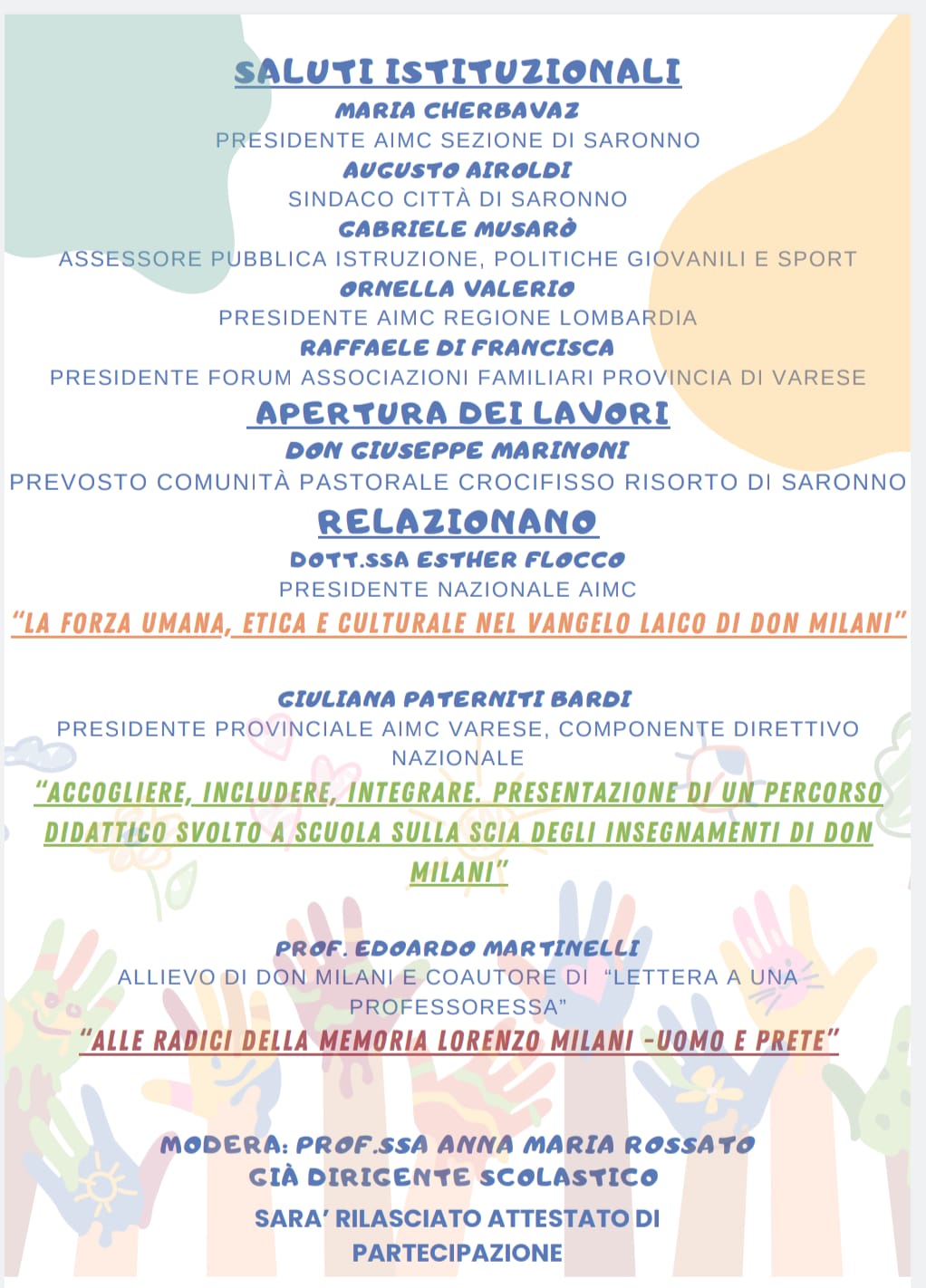 Apriranno i lavori il nuovo Prevosto della Comunità Pastorale Crocifisso Risorto Saronno, mons. Giuseppe Marinoni, e la relazione dal titolo “la forza umana, etica e culturale nel vangelo laico di Don Milani” sarà a cura della dott.ssa Esther Flocco Presidente Nazionale AIMC.