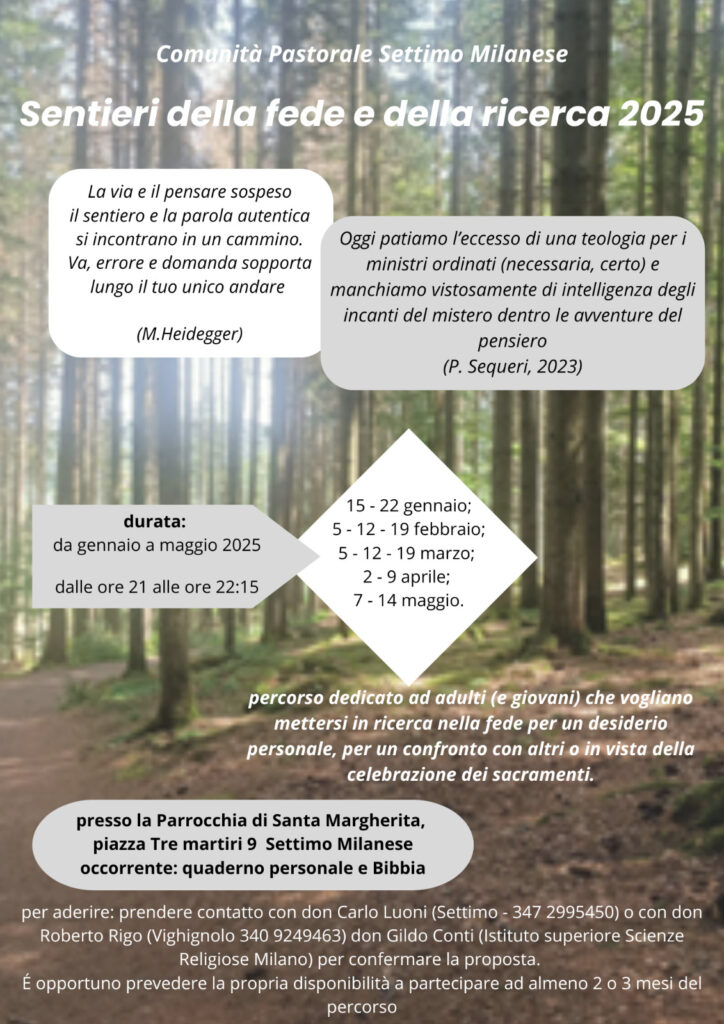 Un tesoro da custodire, ma anche un percorso lungo cui camminare per poterlo valorizzare. La dimensione della fede respira nel cuore dell’uomo. E, con essa, anche il modo di affinarla e di viverla con sempre maggior coerenza e responsabilità. Ma da dove partire per percorrere questo sentiero? La comunità parrocchiale di Settimo Milanese proverà a dare qualche risposta in una serie di incontri intitolati “Sentieri della ricerca e della fede” che partirà dal 12 gennaio e si protrarrà sino al 14 maggio in un ciclo di undici serate con cadenza di due o tre al mese rivolte ad adulti e giovani. Per gennaio gli appuntamenti saranno per i giorni 12 e 22, per febbraio il 5,12 e 19, stesse date per marzo.