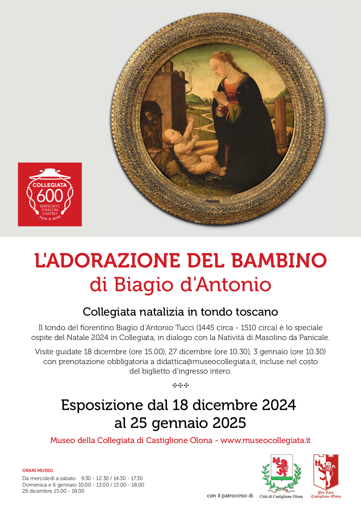 Dal 18 dicembre 2024 al 25 gennaio 2025 si svolgerà la mostra “L’Adorazione del Bambino di Biagio d’Antonio. Collegiata natalizia in tondo toscano”, con l’esposizione di un tondo quattrocentesco del fiorentino Biagio d’Antonio Tucci, in prestito da un collezionista privato e pertanto normalmente non visibile.