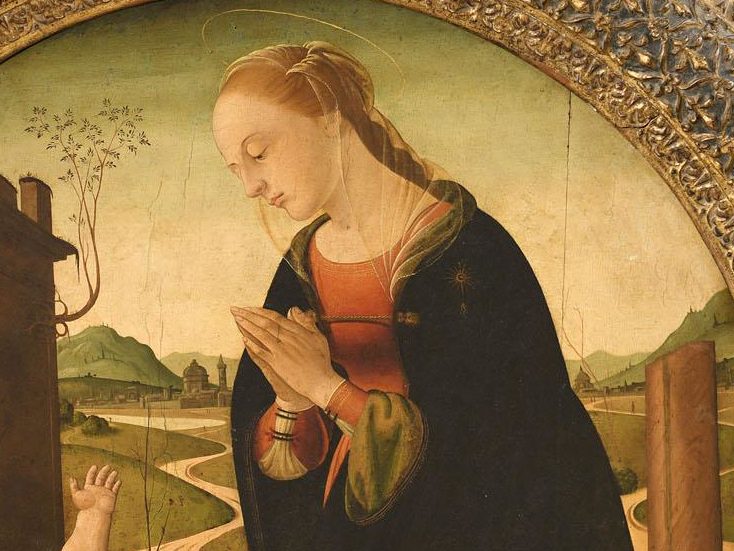 Gesù Bambino protende le mani e lo sguardo verso Maria che lo adora a mani giunte. La Madonna ha gli occhi semichiusi, secondo un’attitudine cara a Biagio d’Antonio, perché appaia la malinconica consapevolezza della sua sofferenza futura. Un velo trasparente copre i capelli della Vergine, morbidamente raccolti, così come un sottile velo avvolge la nudità del Bimbo, che tuttavia resta visibile perché sia manifesto che Dio si è fatto carne. Il manto blu della Madre si allunga a terra per proteggere il Figlio, appoggiato a una pietra e a una fascina di spighe di grano, rimando al pane eucaristico e alla futura offerta di sé.