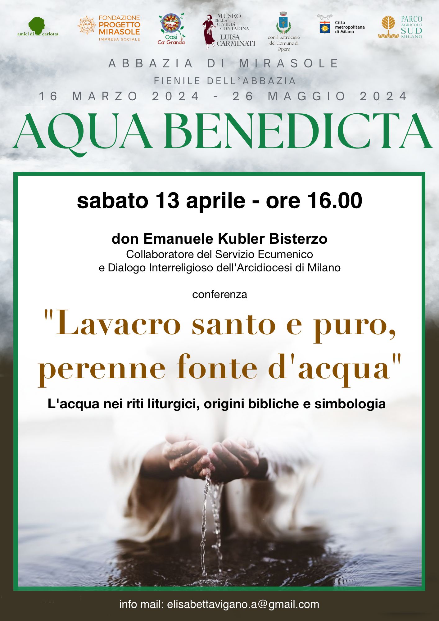 Da 16 marzo al 26 maggio all’Abbazia di Mirasole a Opera sarà possibile visitare la mostra “Aqua Benedicta”. Un viaggio nel tempo attraverso oggetti del mondo rurale del secolo scorso e immagini alla scoperta dell’importanza dell’acqua per l’agricoltura e per la vita quotidiana e spirituale nel Basso milanese. Venticinque quadri didattici a matite colorate realizzati su carta da Luisa Carminati (1927- 1986).