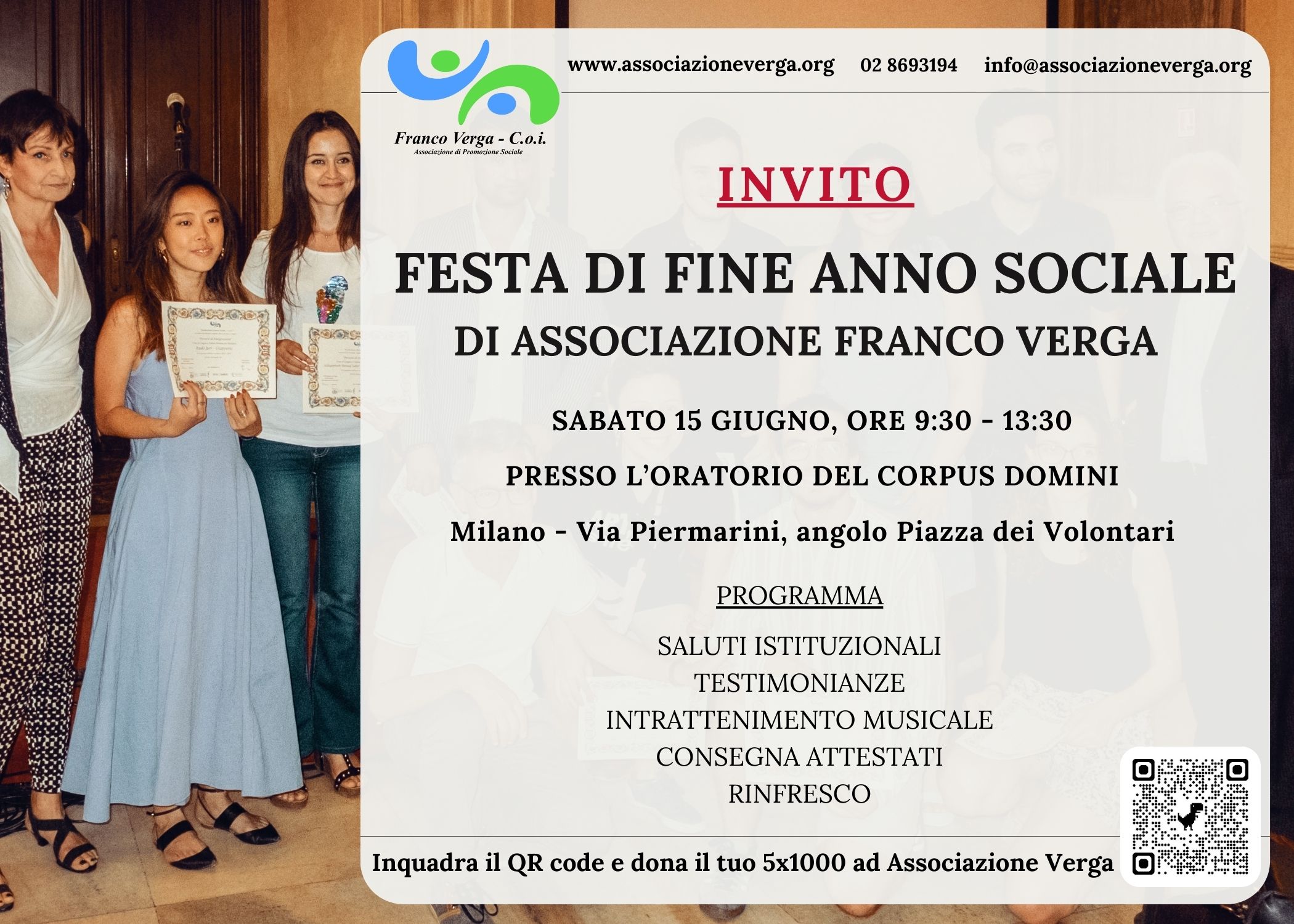 L’Associazione Franco Verga nell’ambito dei festeggiamenti per i suoi 60 e più anni di attività, organizza la “Festa di fine anno sociale” che si svolgerà il 15 giugno dalle ore 9.30 alle 13:30 presso l’oratorio del Corpus Domini a Milano in via Piermarini, angolo Piazza dei Volontari.