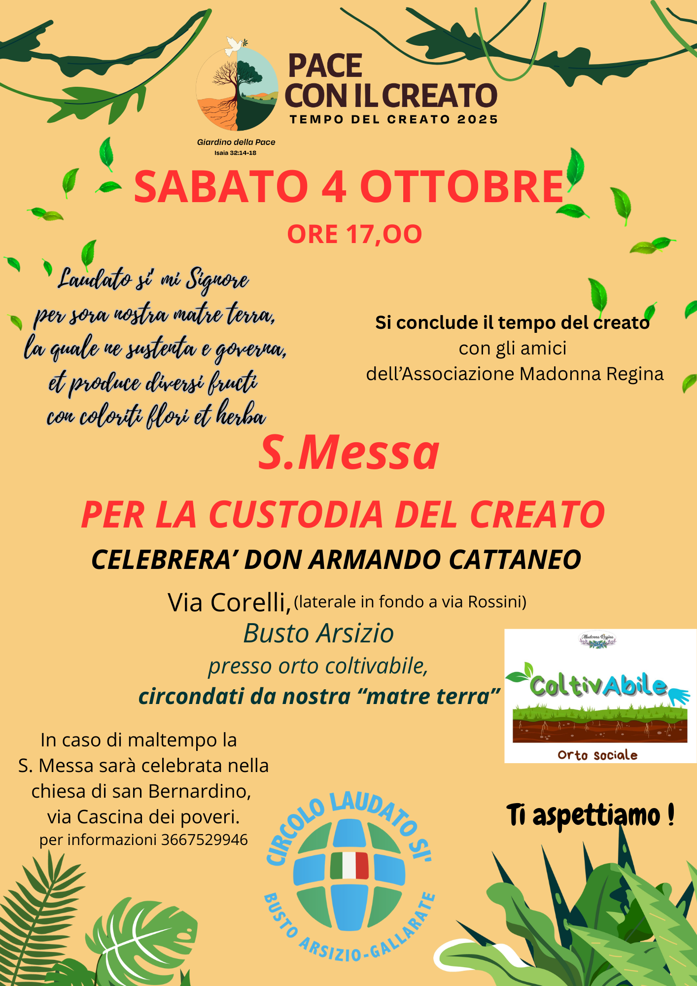 Sabato 4 ottobre il circolo Laudato si Busto Arsizio- Gallarate conclude il tempo del creato con una Messa in mezzo agli orti coltivati dai genitori, dai volontari e dai ragazzi dell’associazione Madonna Regina.