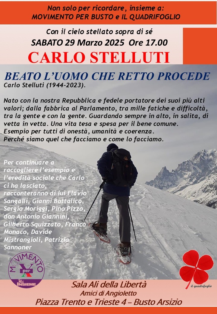 Sabato 29 marzo alle 17, presso la Sala Ali della Libertà (piazza Trento e Trieste, 4) Movimento per Busto e Il Quadrifoglio ricordano Carlo Stelluti, attraverso testimonianze di ospiti d’eccezione. Dal Sindacato a Montecitorio, dal Kosovo in Guerra a Sindaco contro la mafia passando per l’attivismo politico e sociale bustocco.
