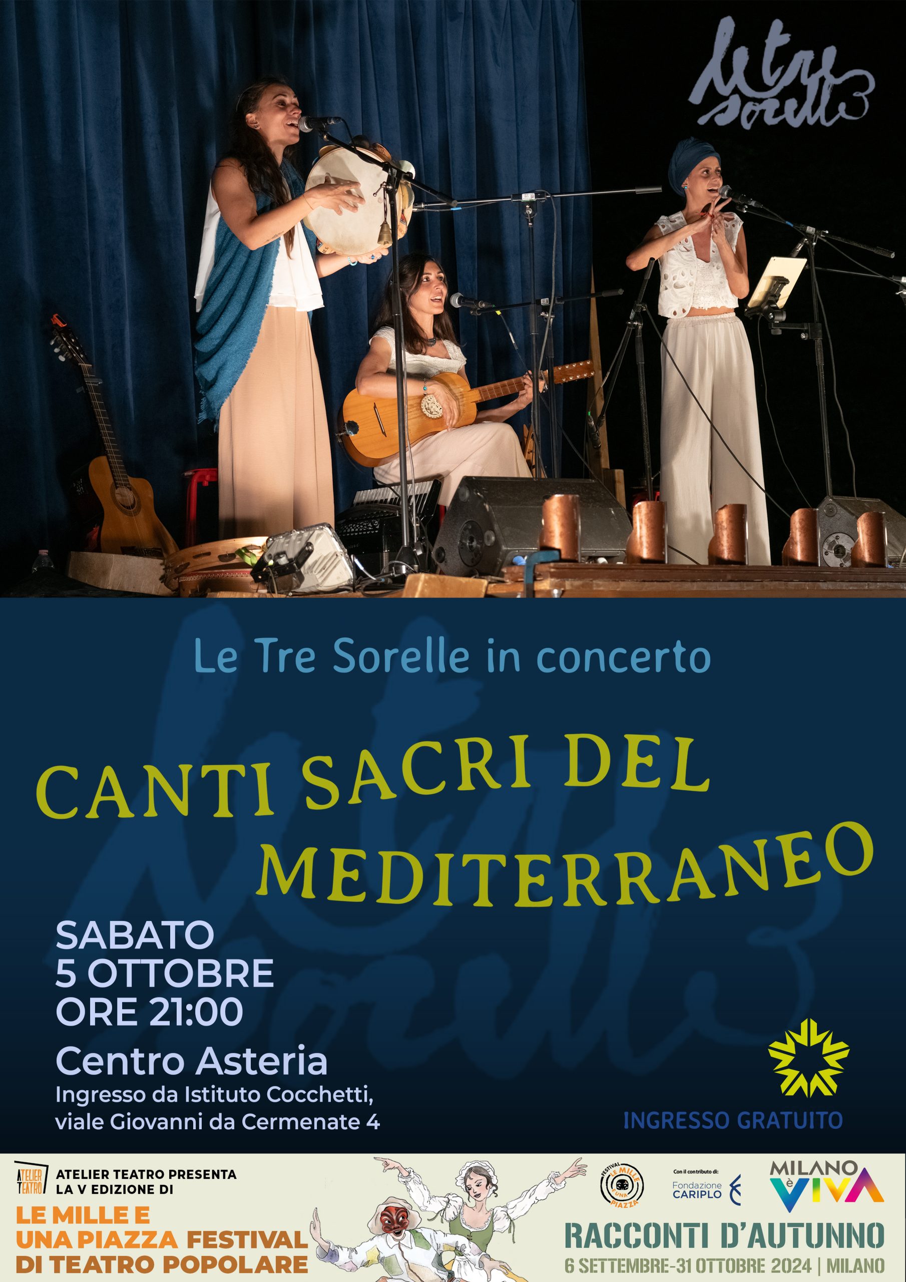 Sabato 5 ottobre alle 21 al Centro Asteria di Milano si terrà un concerto all’insegna di canti polifonici sacri, sia colti sia popolari, di diverse culture dell’area Mediterranea a cura del gruppo “Le tre sorelle”.