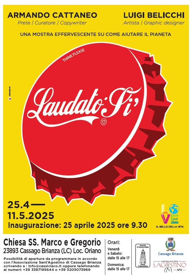 Dal 25 aprile all’11 maggio, la chiesa dei SS. Gregorio e Marco a Oriano ospiterà la mostra “Laudato Si’”, venti opere dipinte a mano dall’artista Luigi Belicchi in uno stile che richiama la Pop Art, rendendo i temi dell’Enciclica accessibili e coinvolgenti, soprattutto per i giovani. Ogni pannello è accompagnato da brevi testi e slogan ironici, pensati da don Armando Cattaneo, che stimolano la riflessione e invitano i visitatori a interrogarsi sul proprio ruolo nella salvaguardia della nostra Casa Comune.