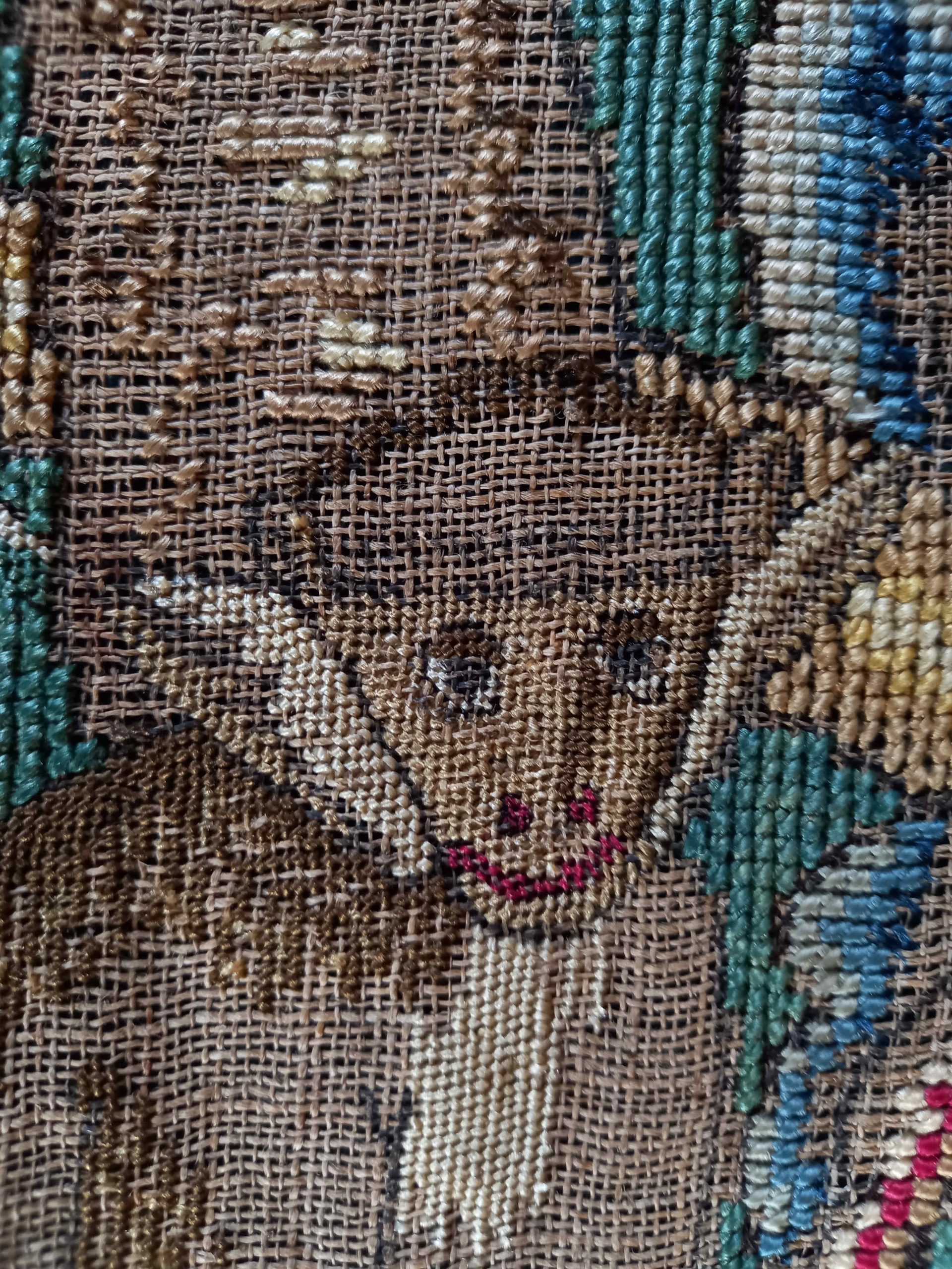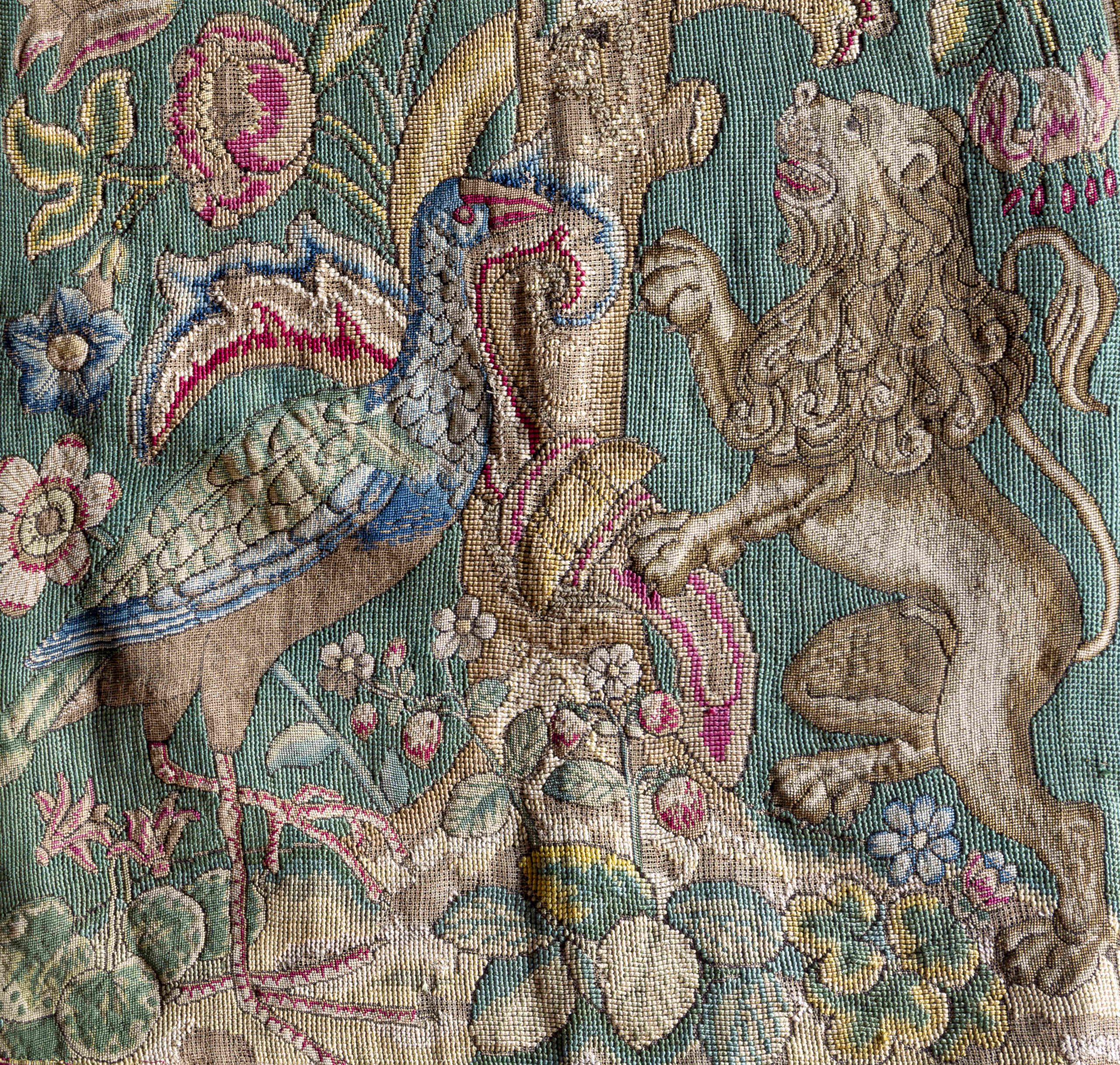 Una sequenza di girali di fantasia genera molti fiori (tulipani, iris, gigli, narcisi, aquilegie, convolvoli, garofani), avviluppandosi intorno a un albero che produce pere e susine. Dal terreno spuntano ciclamini e piantine di fragole. Sull’albero convivono animali esotici, come la scimmia e il pappagallo, e alcuni uccelli in volo o intenti a mangiare una noce, mentre alla base stanno in posa un leone e un più ruspante pollo sultano.