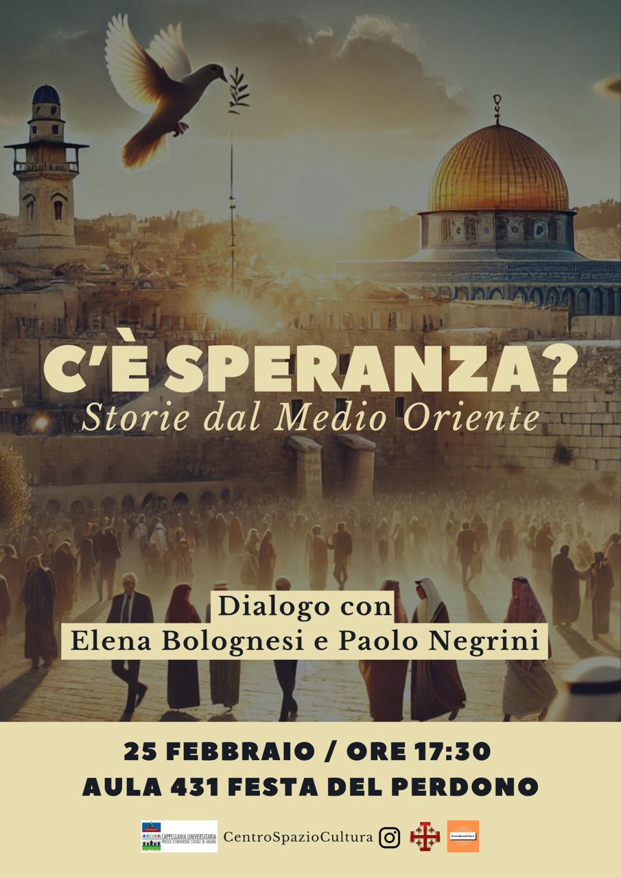 Martedì 25 febbraio alle ore 17.30 presso l’aula 431 della sede di via Festa del Perdono 7 dell’Università degli Studi di Milano, il Centro culturale della Cappellania Universitaria propone un nuovo incontro dal titolo: “C’è Speranza? Storie dal Medio Oriente”.