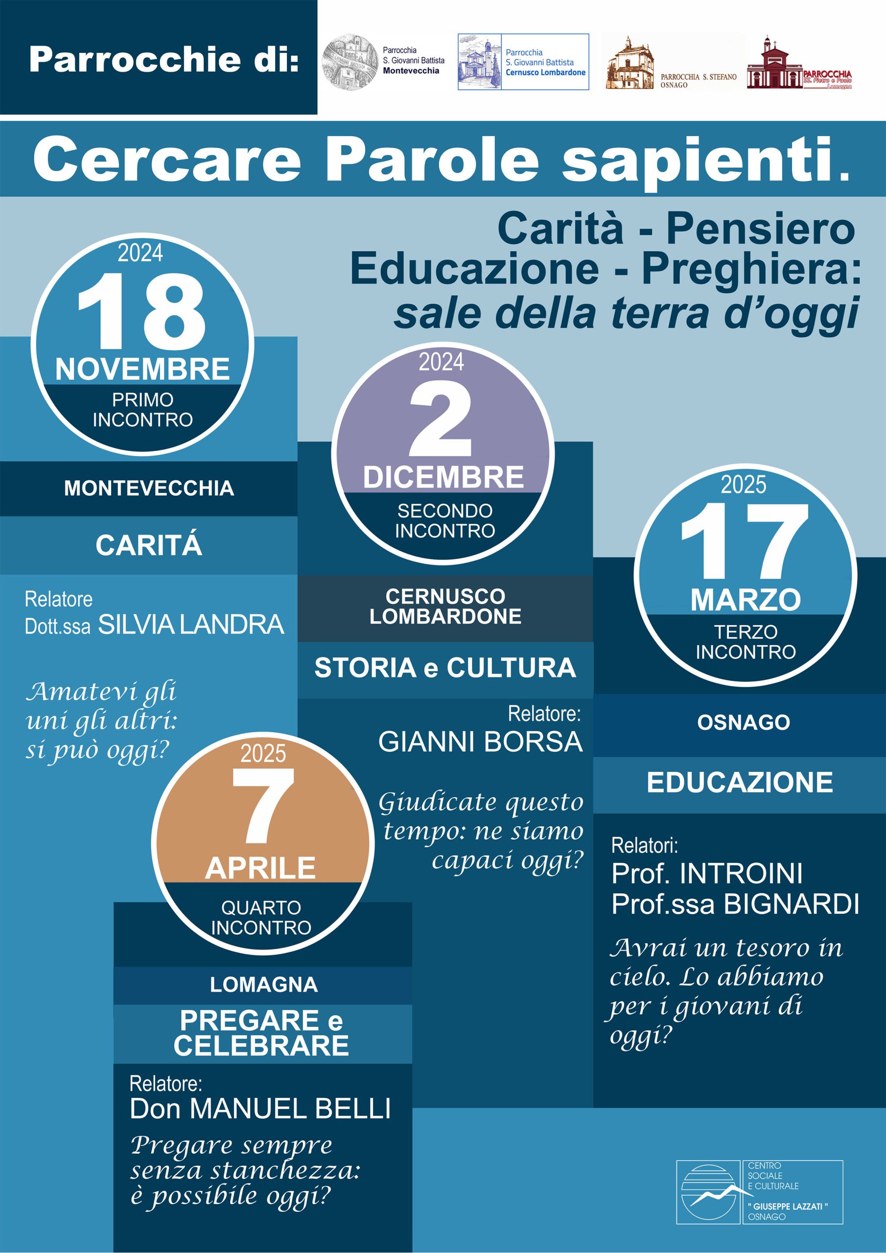 In occasione dell’Avvento le parrocchie di Montevecchia, Cernusco Lombardone, Osnago e Lomagna organizzano un ciclo di quattro incontri intitolato “Cercare parole sapienti” su Carità (18 novembre), storia e cultura (2 dicembre), educazione (17 marzo) e pregare e celebrare (7 aprile).