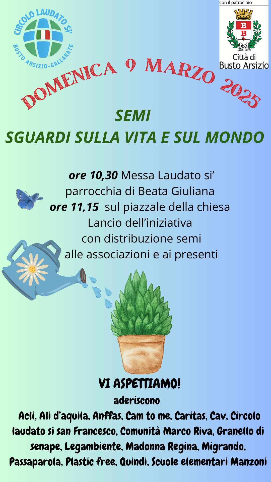 Domenica 9 marzo il Circolo Laudato si’ di Busto Arsizio-Gallarate organizza un’iniziativa che darà il via a un cammino sotto l’egida dei «Semi» che coinvolgerà numerose associazioni della città di Busto Arsizio. Alle 10.30 sarà celebrata la Messa nella parrocchia Beata Giuliana. Alle 11.15 saranno distribuiti i semi alle associazioni e ai presenti.