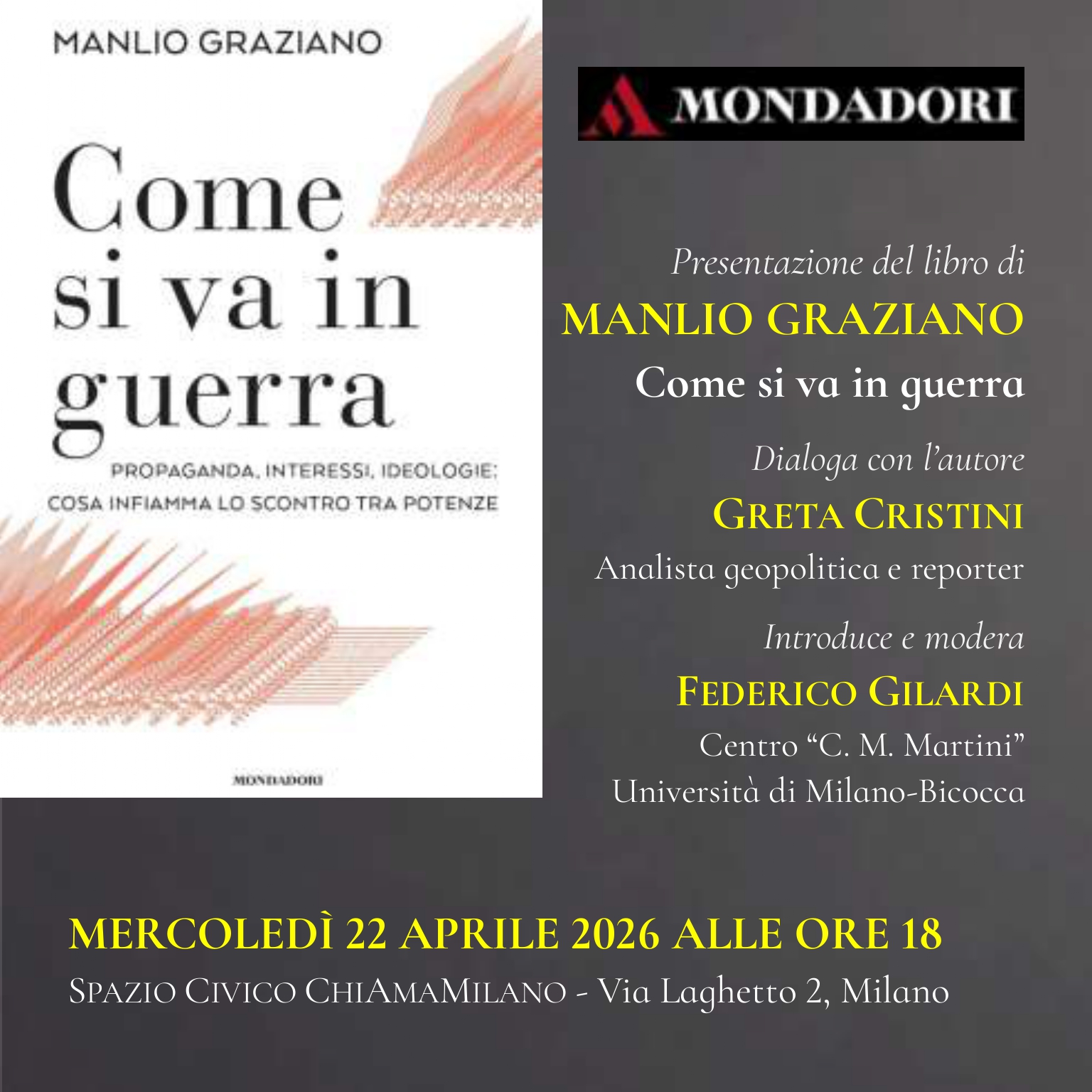 Mercoledì 22 aprile alle 18, allo Spazio Civico ChiAmaMilano in via Laghetto 2, il Professor Manlio Graziano approfondirà i contenuti del suo nuovo saggio Come si va in guerra (Mondadori) discutendo con l’analista e reporter Greta Cristini. A introdurre e moderare il dibattito sarà Federico Gilardi del Centro “C. M. Martini” nell’Università degli Studi di Milano-Bicocca.