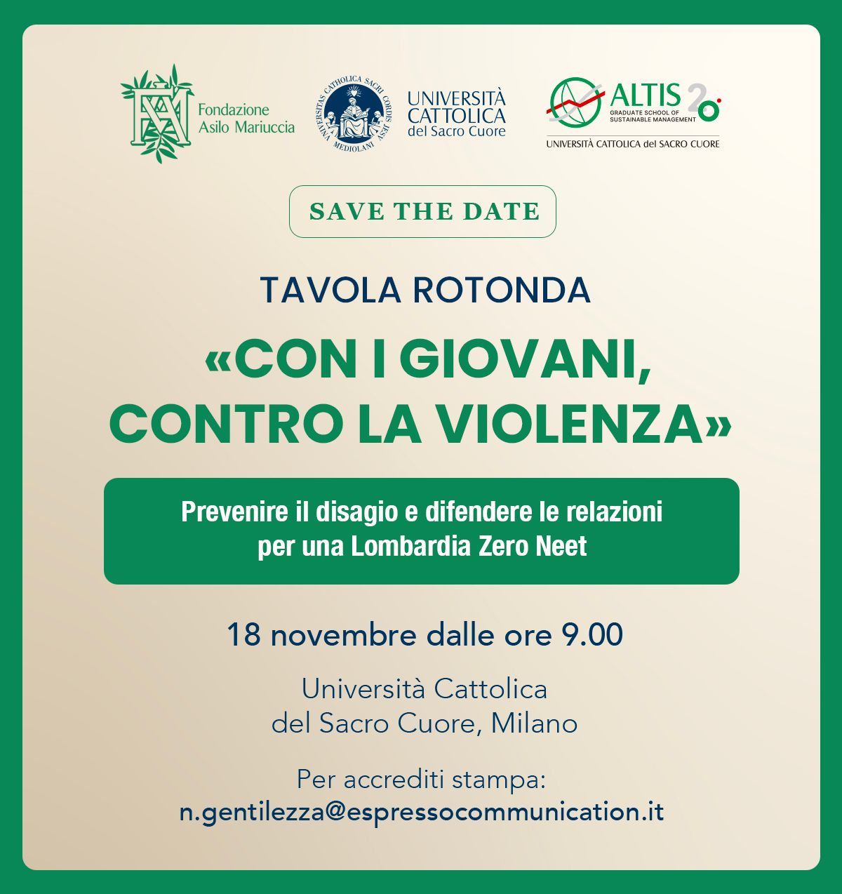 Martedì 18 novembre alle 9, presso l’Università cattolica del Sacro Cuore di Milano, si svolgerà l’evento “Con i giovani, contro la violenza”, promosso da Fondazione Asilo Mariuccia e Università Cattolica del Sacro Cuore.