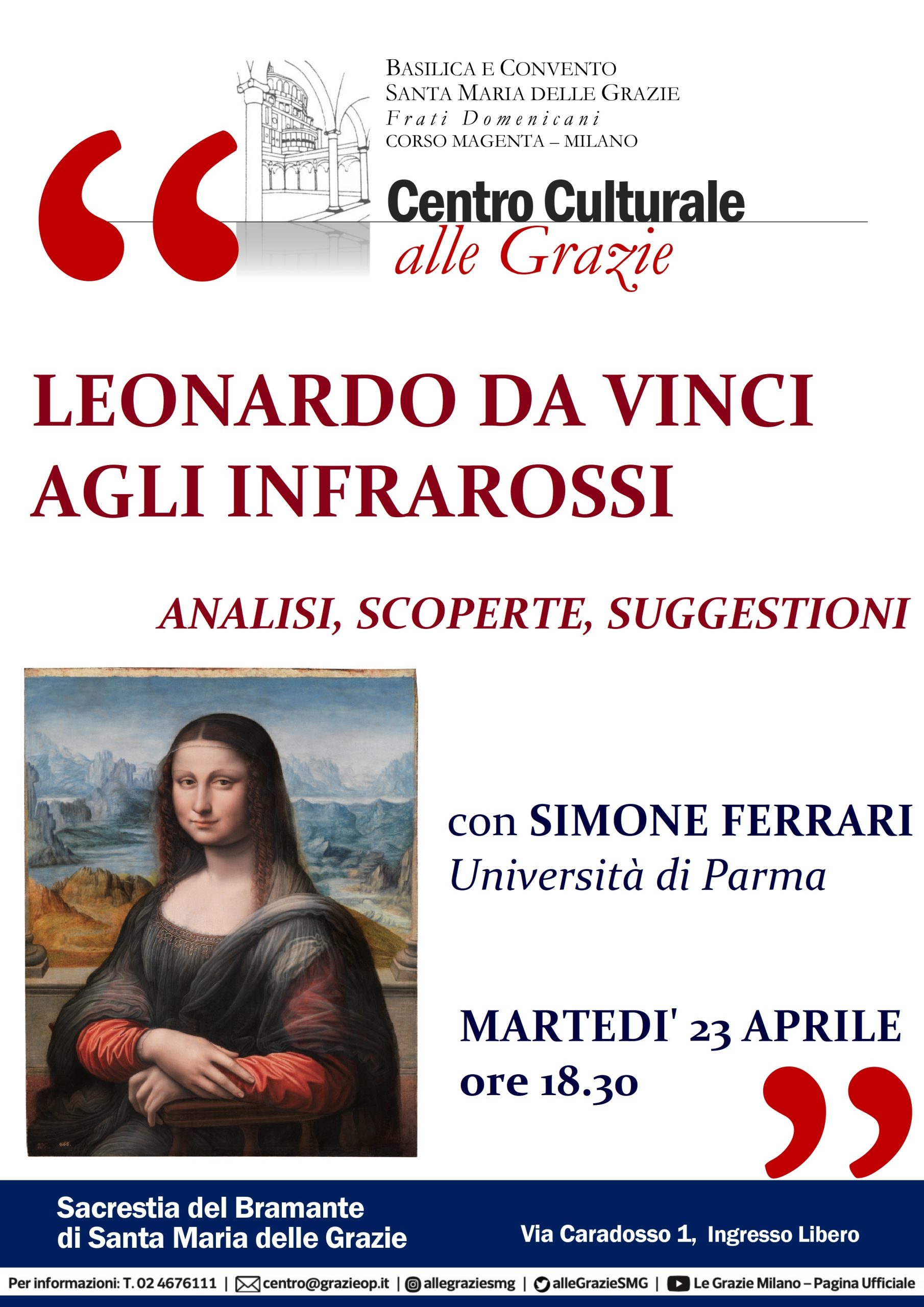 Martedì 23 aprile alle ore 18.30 il Centro Culturale alle Grazie di Milano organizza “Leonardo da Vinci agli infrarossi. Analisi, scoperte, suggestioni” con il prof. Simone Ferrari, docente di Storia dell’arte moderna all’Università di Parma. Una serata alla scoperta di particolari inediti e nuove scoperte e ipotesi sulle opere leonardesche grazie alle nuove tecnologie.