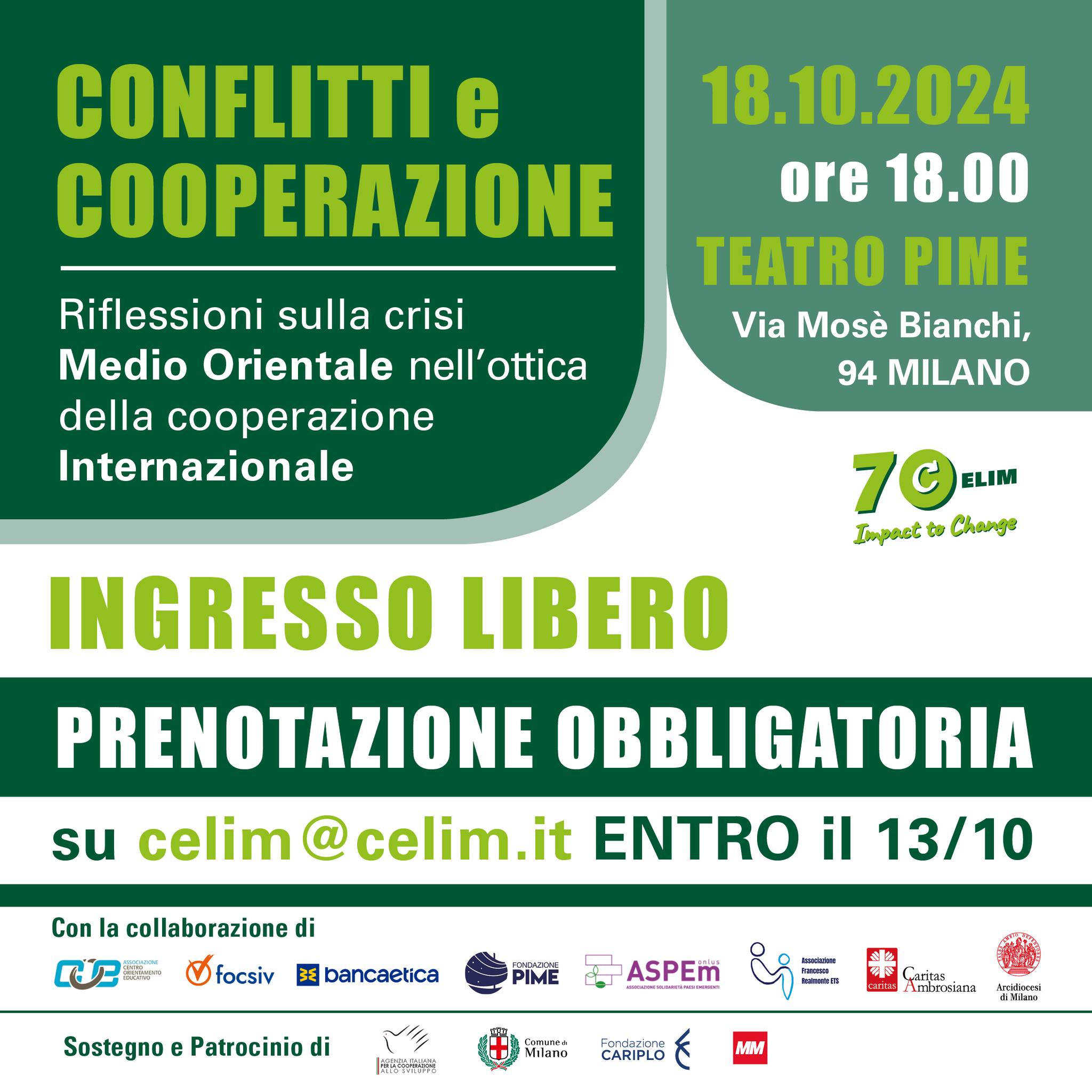 “Conflitti e cooperazione – Riflessioni sulla crisi mediorientale nell’ottica della cooperazione internazionale” è il titolo dell’incontro che Celim- Centro Laici Italiani per le Missioni organizza il 18 ottobre (ore 18) nel teatro del Pime a Milano, in via Mosè Bianchi 94.
