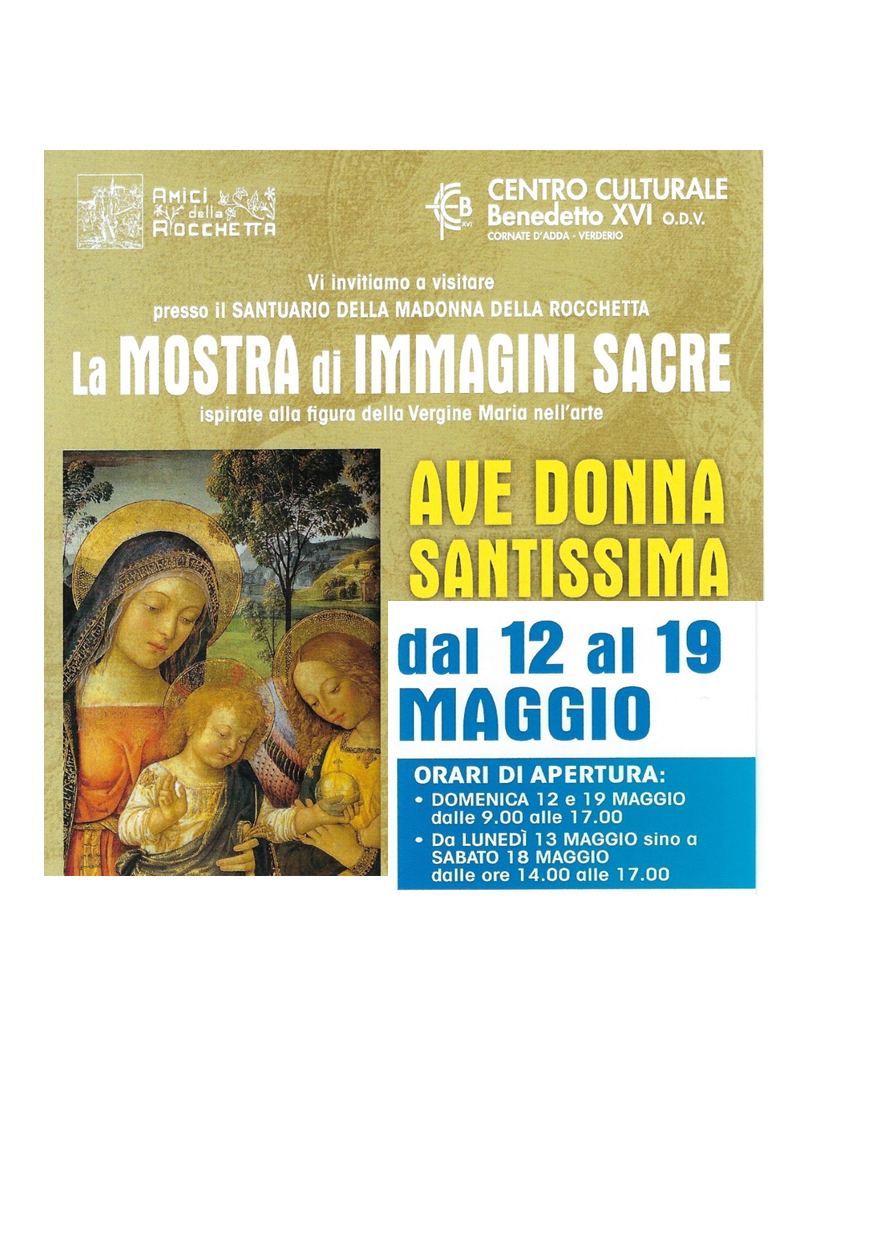 L’arte di rappresentarla affonda le sue radici dopo i primi secoli del Cristianesimo. E, da allora, si è sempre più diffusa impegnando i migliori ingegni pittorici e scultorei di ogni tempo. La figura della Vergine Maria sarà al centro della mostra di immagini sacre dal titolo “Ave donna Santissima” e in programma al Santuario della Madonna della Rocchetta di Cornate d’Adda da domenica 12 a domenica 19 maggio.