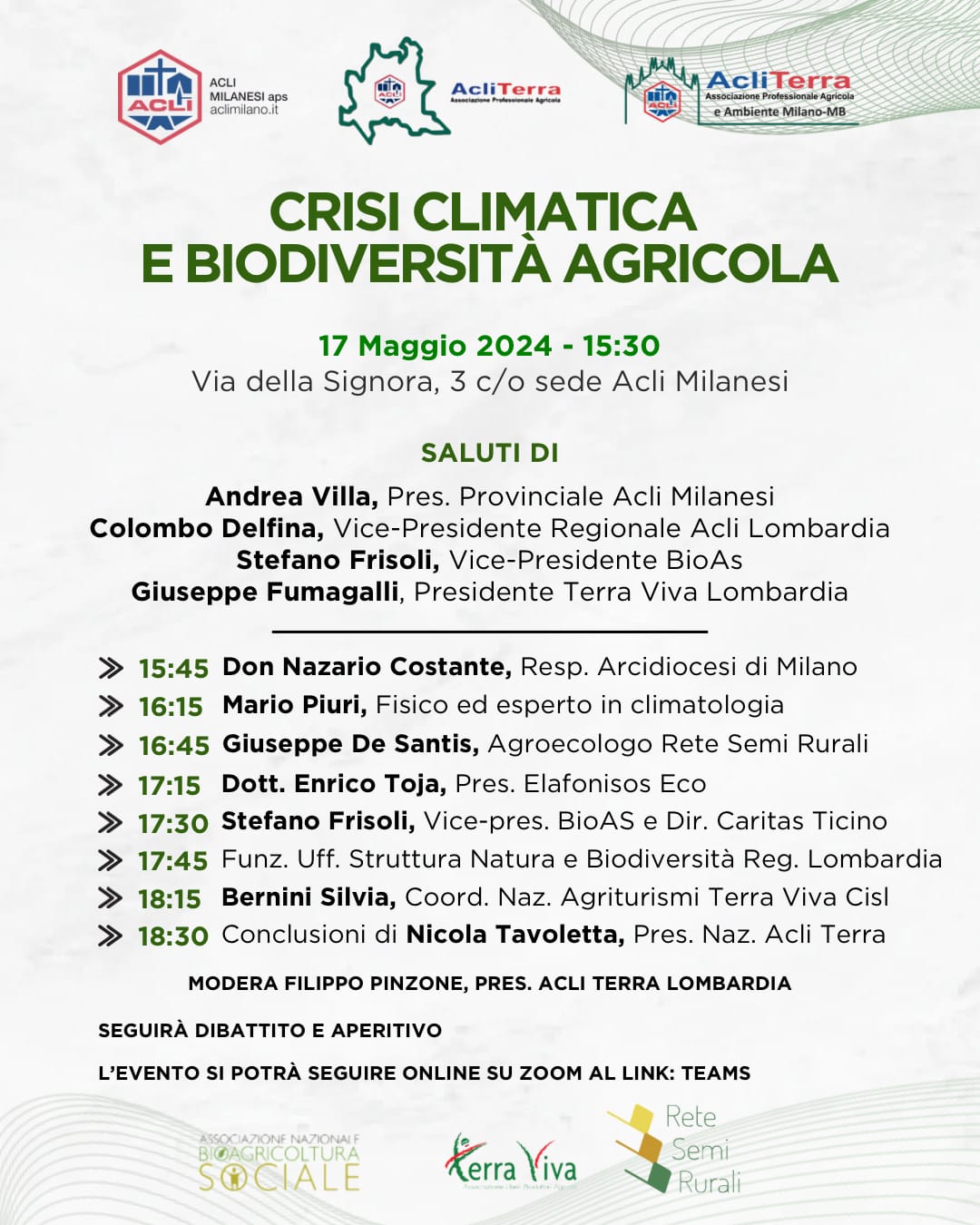 Gli interventi prevedono la partecipazione di alcuni relatori don Nazario Costante responsabile Pastorale Sociale e del Lavoro Diocesi di Milano, e alcuni esperti  nel campo  della climatologia, dell’agroecologia e dell’ecologia, che condivideranno le loro conoscenze e esperienze.