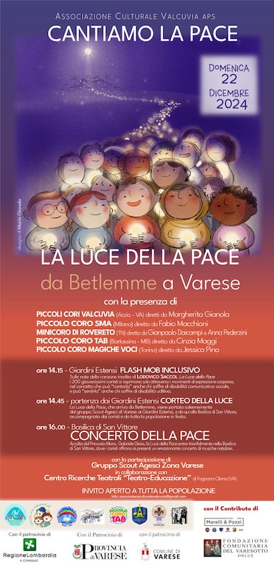 Nella Basilica di San Vittore a Varese, domenica 22 dicembre alle ore 16, duecento bambini e ragazzi di 5 cori della Galassia dell’Antoniano (da Milano, Varese, Barlassina, Rovereto, Torino) accoglieranno cantando la Luce della Pace di Betlemme portata dal gruppo scout Agesci zona Varese. A Betlemme, nella chiesa della Natività, vi è una lampada che arde perennemente da molti secoli, alimentata dall’olio donato a turno da tutte le Nazioni cristiane della Terra. Ogni anno, a Dicembre, da quella fiammella ne vengono accese altre che sono poi diffuse in tutto il mondo, come simbolo di pace e fratellanza fra i popoli.