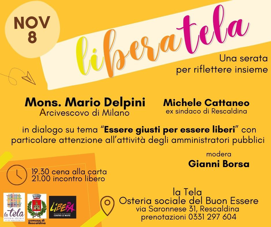 L’Arcivescovo di Milano Mario Delpini dialoga con Michele Cattaneo, già sindaco di Rescaldina, sullo stretto collegamento che lega il senso di Giustizia alla Libertà, con particolare attenzione all’attività degli amministratori pubblici. Modera l’incontro Gianni Borsa.
