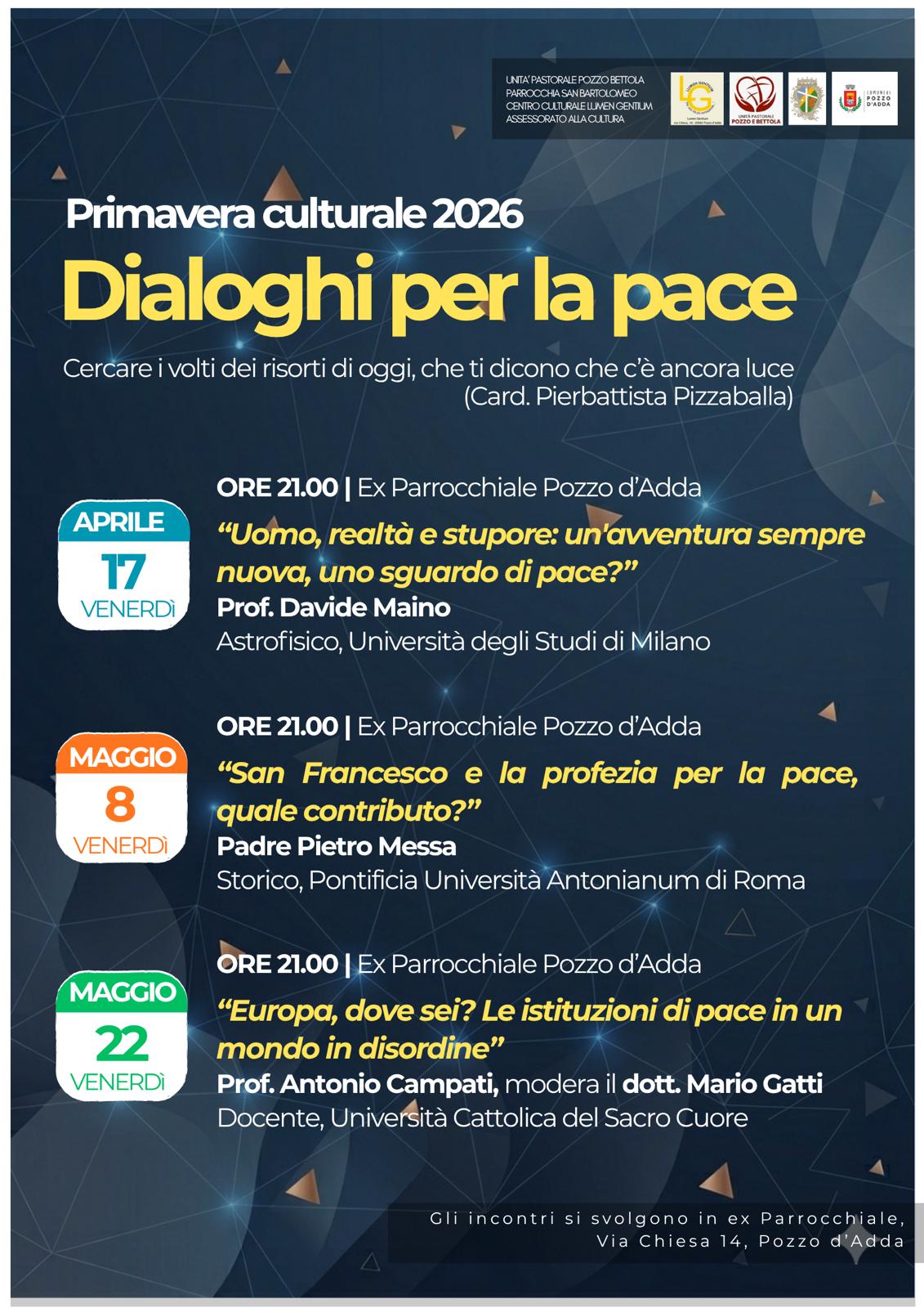 L’Unità Pastorale di Pozzo e Bettola organizza, a partire dal prossimo venerdì 17 aprile, tre incontri sul tema dei “Dialoghi per la Pace”. Un’iniziativa che nasce raccogliendo l’invito del Cardinal Pierbattista Pizzaballa: non fermarsi allo sguardo della cronaca, ma cercare i “volti dei risorti”, quegli sprazzi di vita che irrompono nel buio del presente.