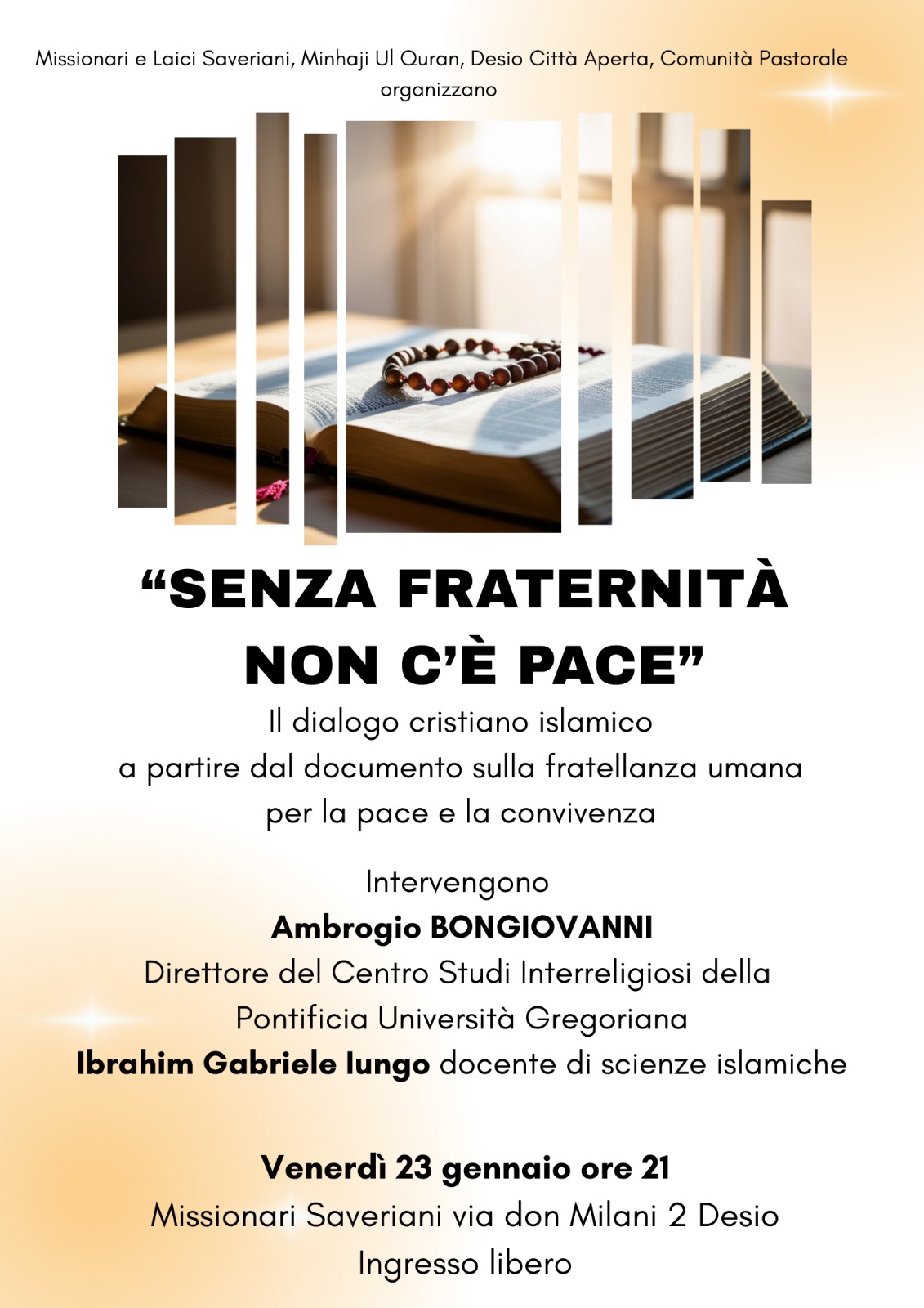 Venerdì 23 gennaio alle 21, dai Missionari Saveriani di Desio, si svolgerà un interessante incontro sul dialogo cristiano-islamico, a partire dal documento sulla fratellanza umana per la pace e la convivenza.